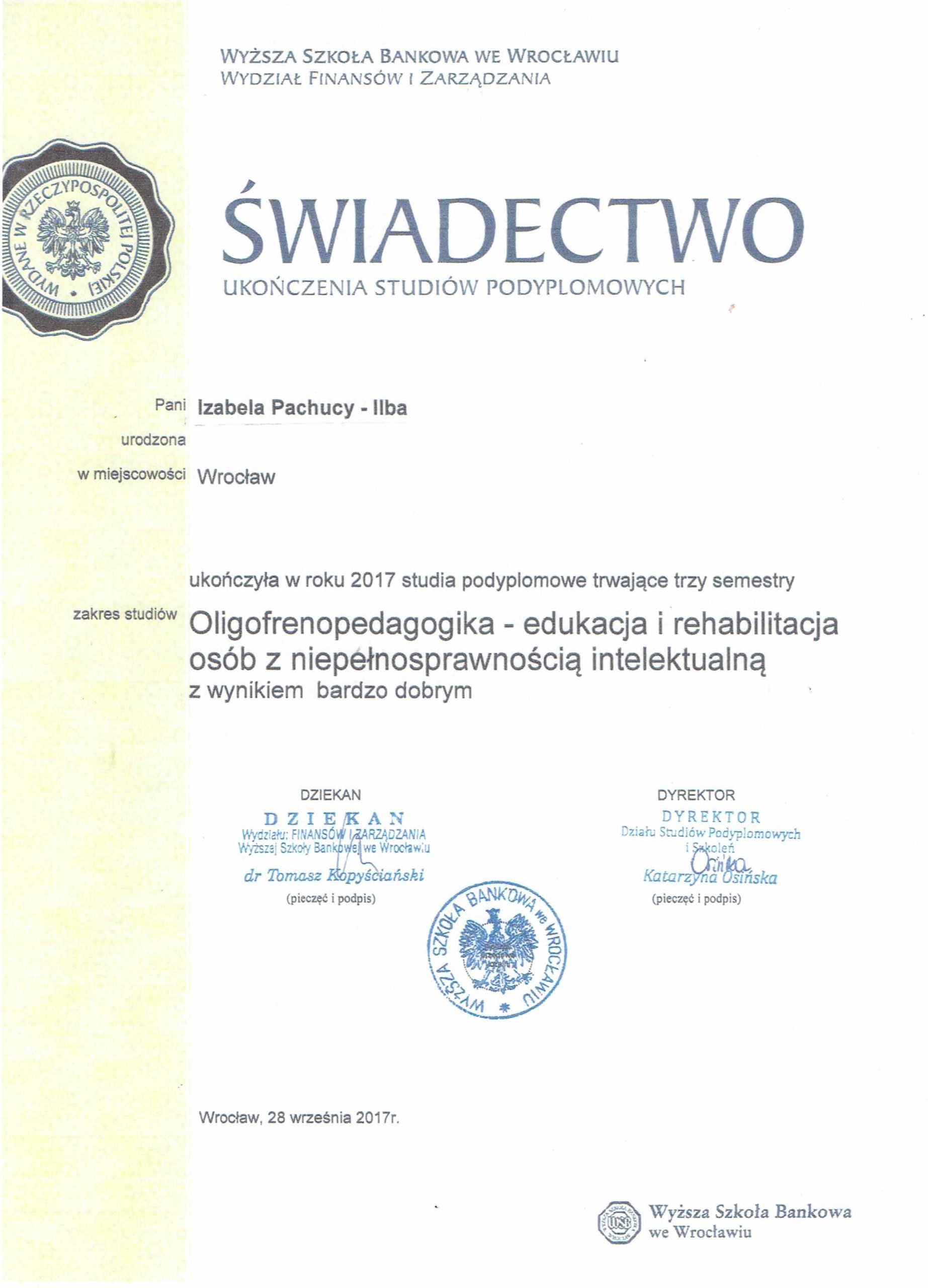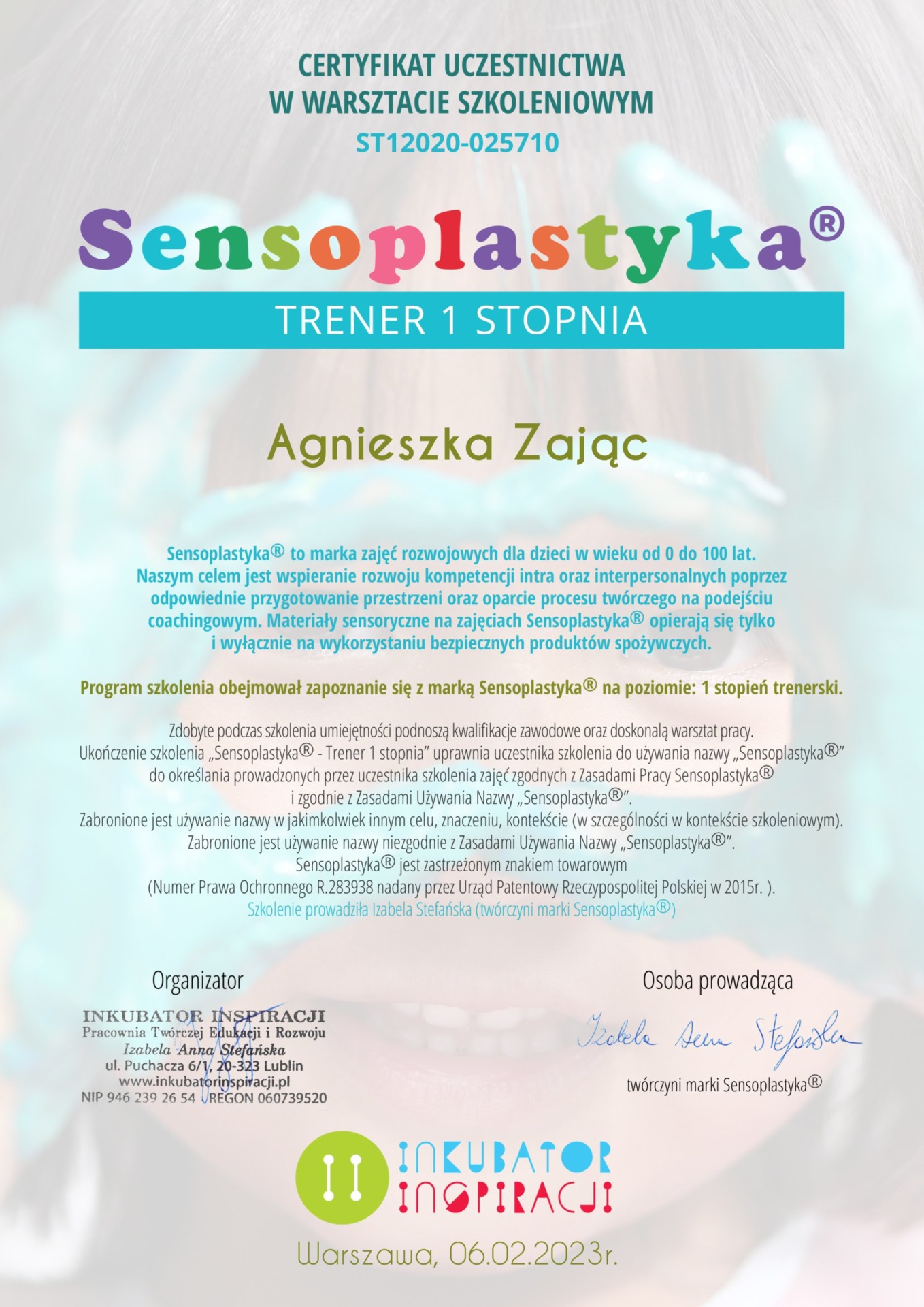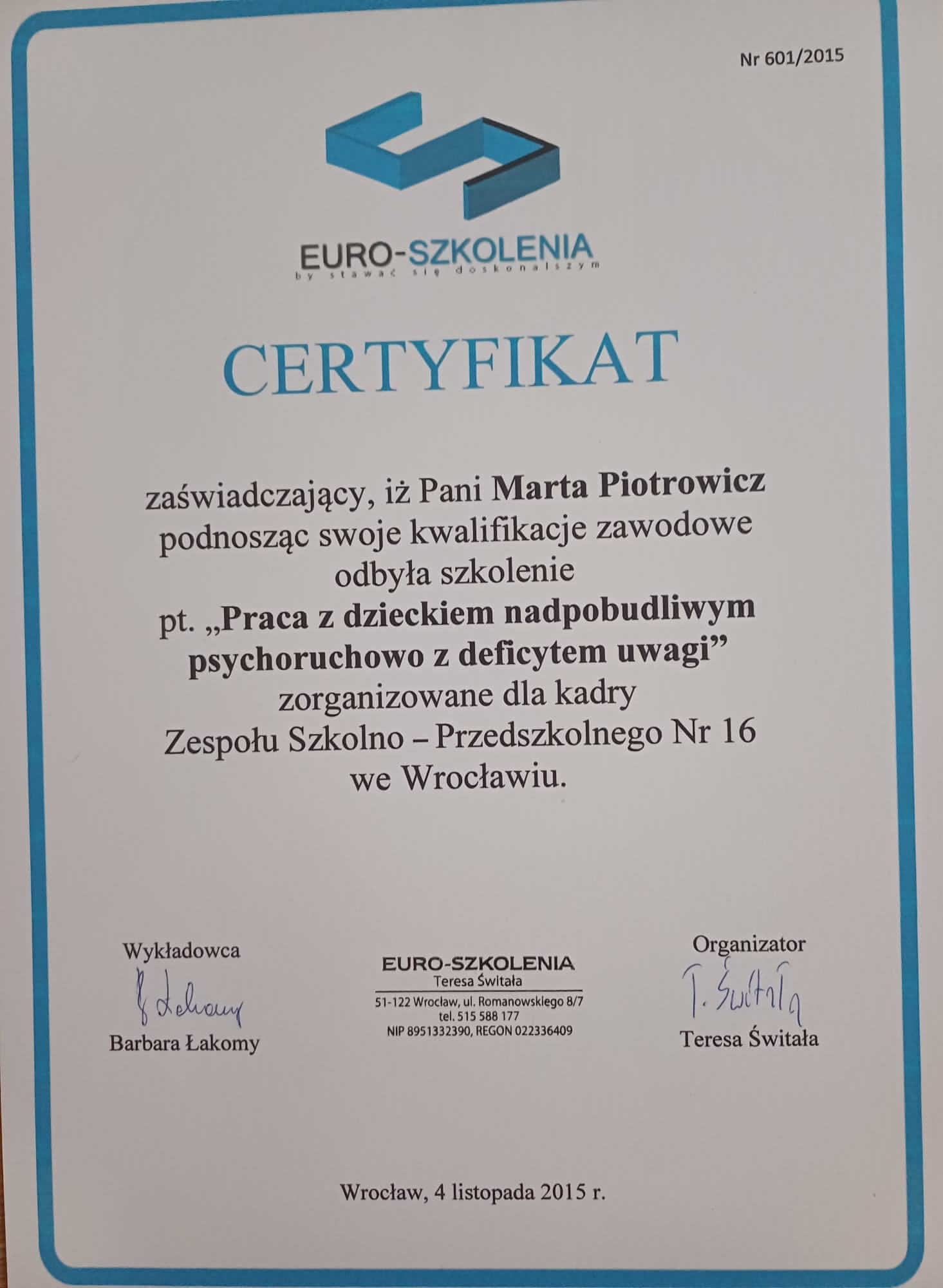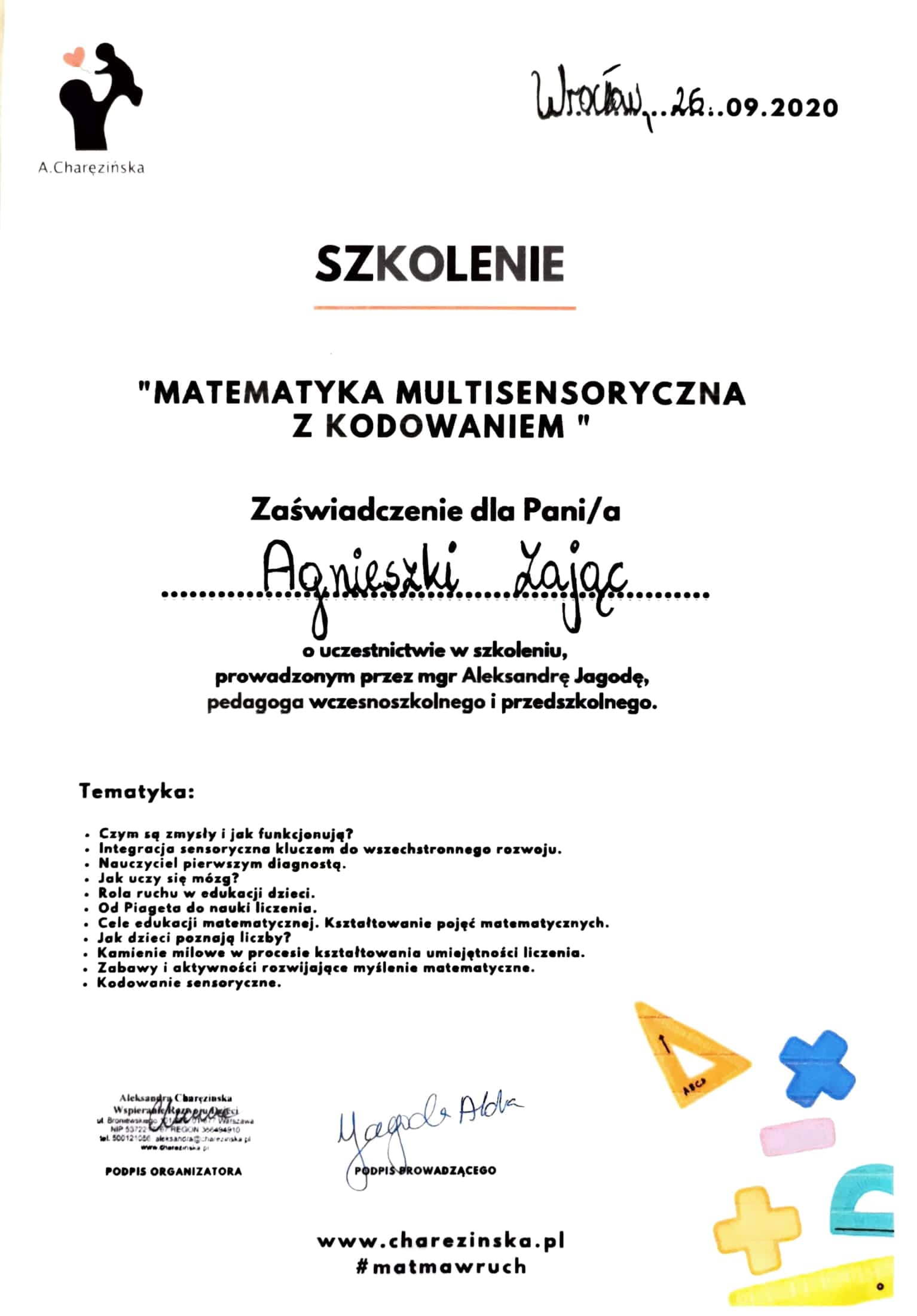 Jestem absolwentką Pedagogiki Specjalnej na Uniwersytecie Wrocławskim, o specjalności Edukacja i Rehabilitacja Osób z Niepełnosprawnością Intelektualną oraz Trenerką Sensoplastyki®, Bare FootTM, Treningu Kreatywnego RozwojuTM i Treningu Kreatywnego Wczesnego RozwojuTM . Pracę z dziećmi uwielbiam, dlatego wkładam w nią całe serce. Staram się ciągle poszerzać swoją wiedzę, aktualnie studiuję dodatkowo wczesne wspomaganie rozwoju dziecka. Uwielbiam zwiedzać ciekawe miejsca, czytać i spacerować z bliskimi.