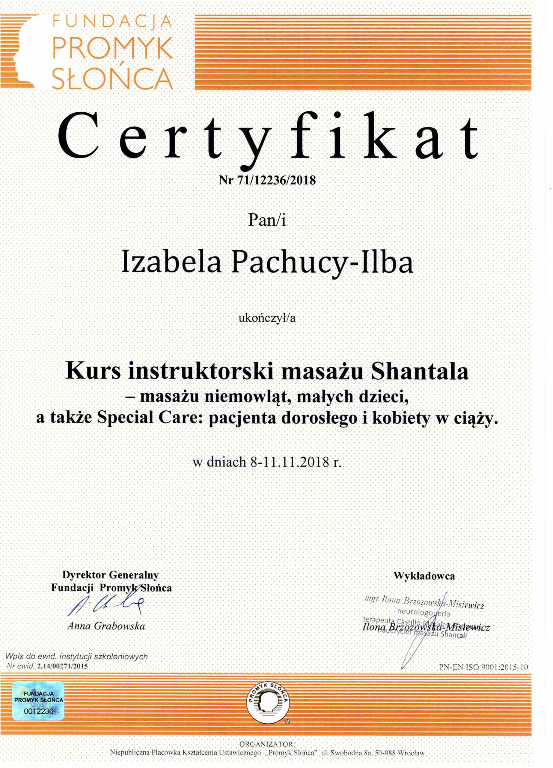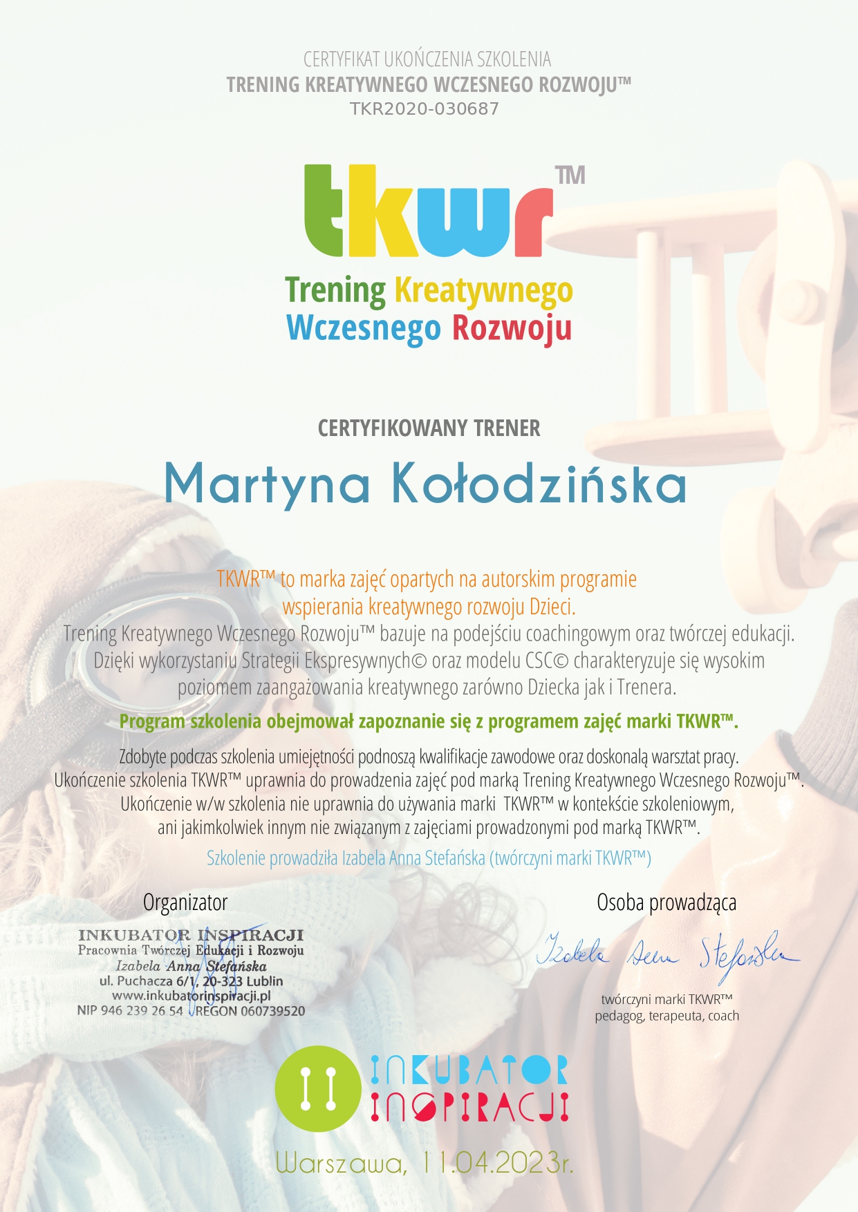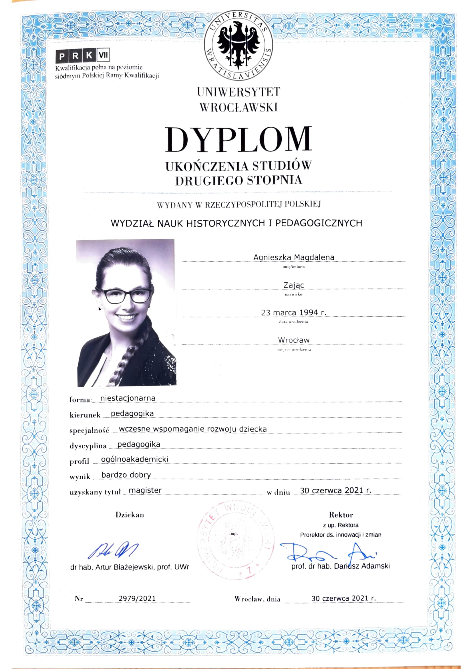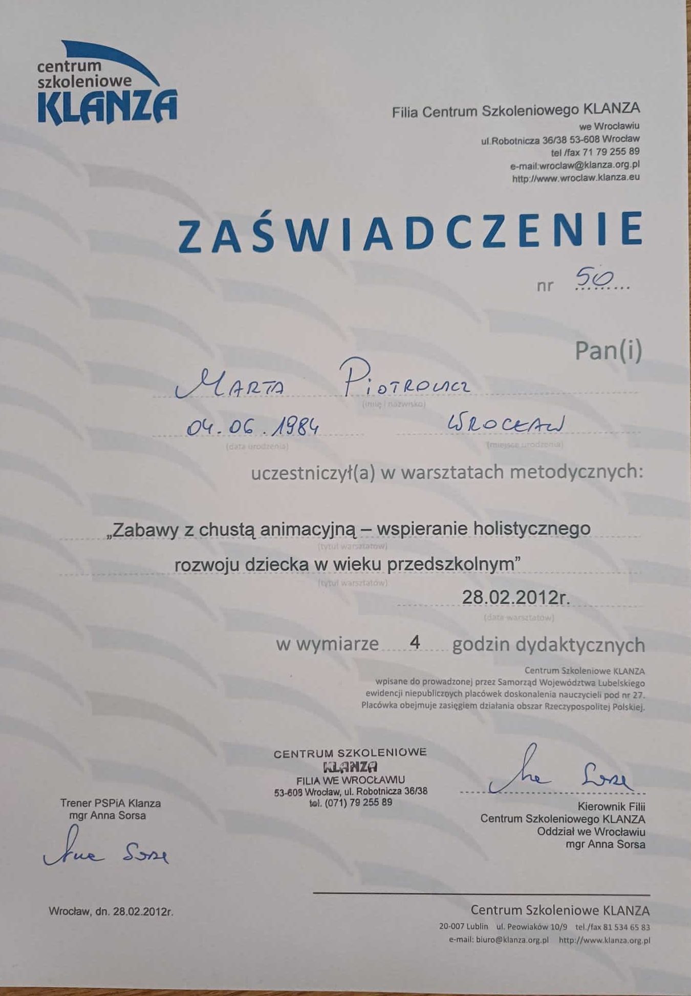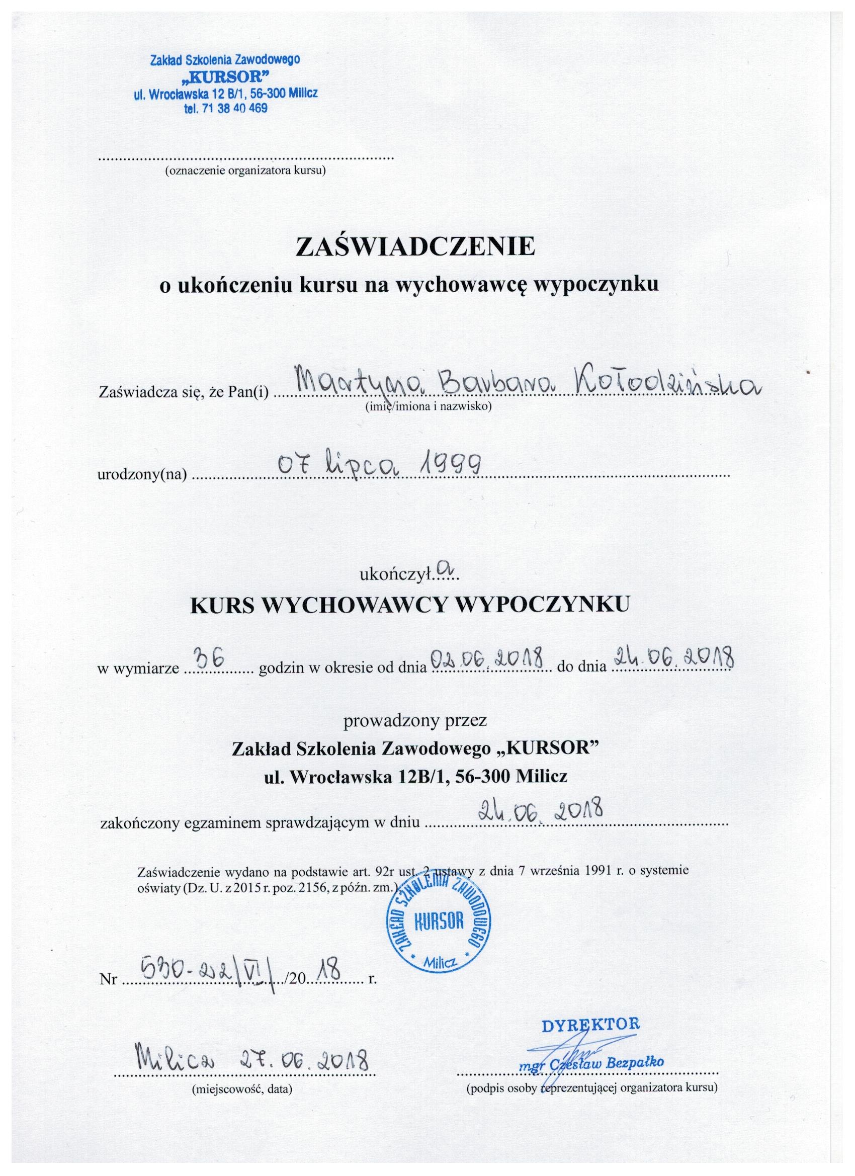 Jestem absolwentką Pedagogiki Specjalnej na Uniwersytecie Wrocławskim, o specjalności Edukacja i Rehabilitacja Osób z Niepełnosprawnością Intelektualną oraz Trenerką Sensoplastyki®, Bare FootTM, Treningu Kreatywnego RozwojuTM i Treningu Kreatywnego Wczesnego RozwojuTM . Pracę z dziećmi uwielbiam, dlatego wkładam w nią całe serce. Staram się ciągle poszerzać swoją wiedzę, aktualnie studiuję dodatkowo wczesne wspomaganie rozwoju dziecka. Uwielbiam zwiedzać ciekawe miejsca, czytać i spacerować z bliskimi.