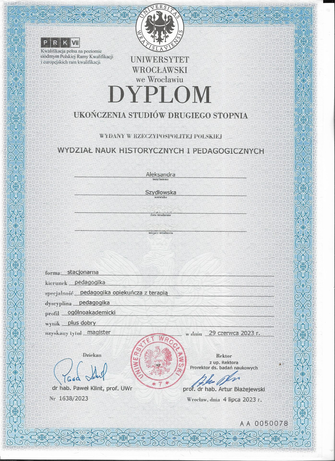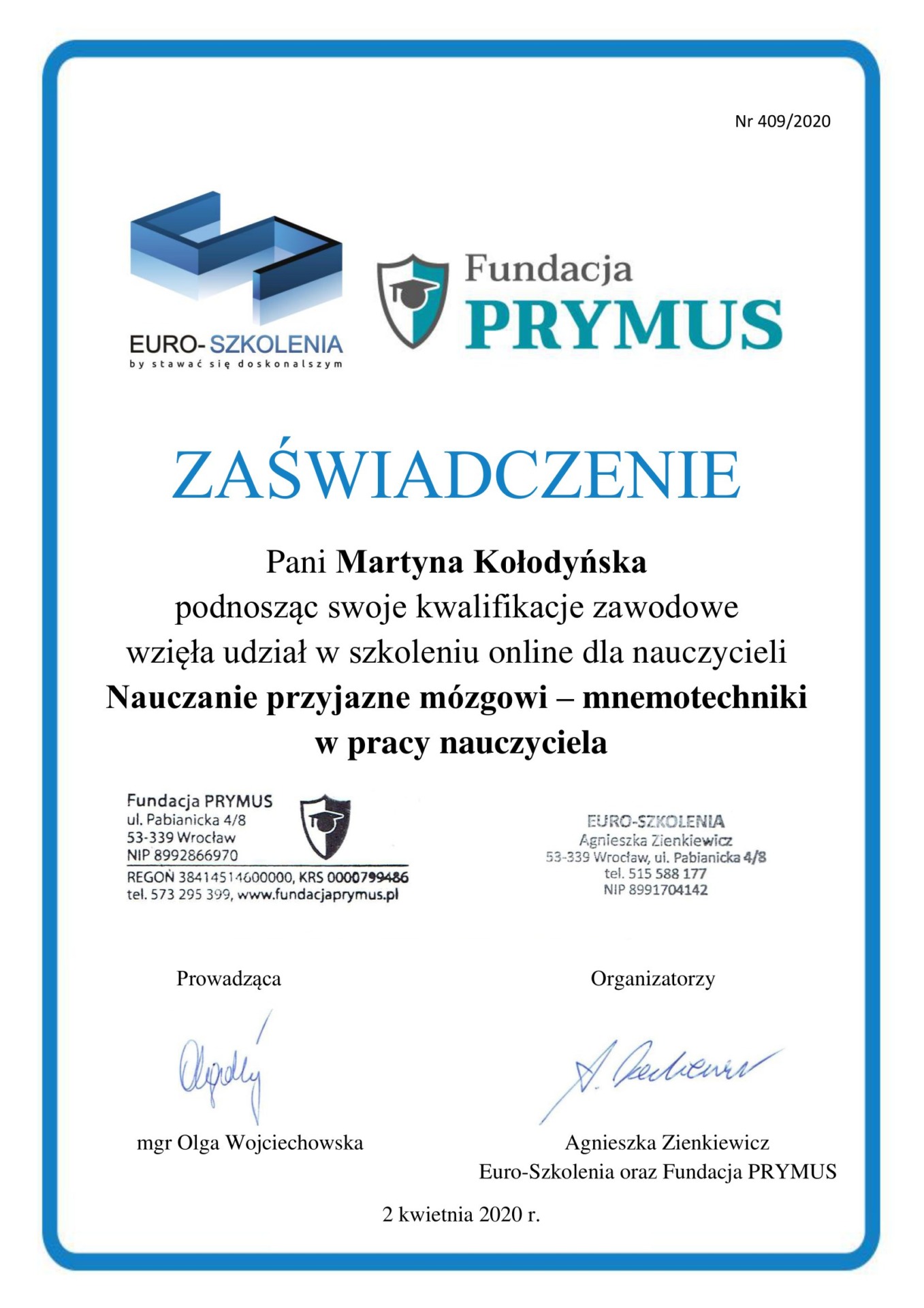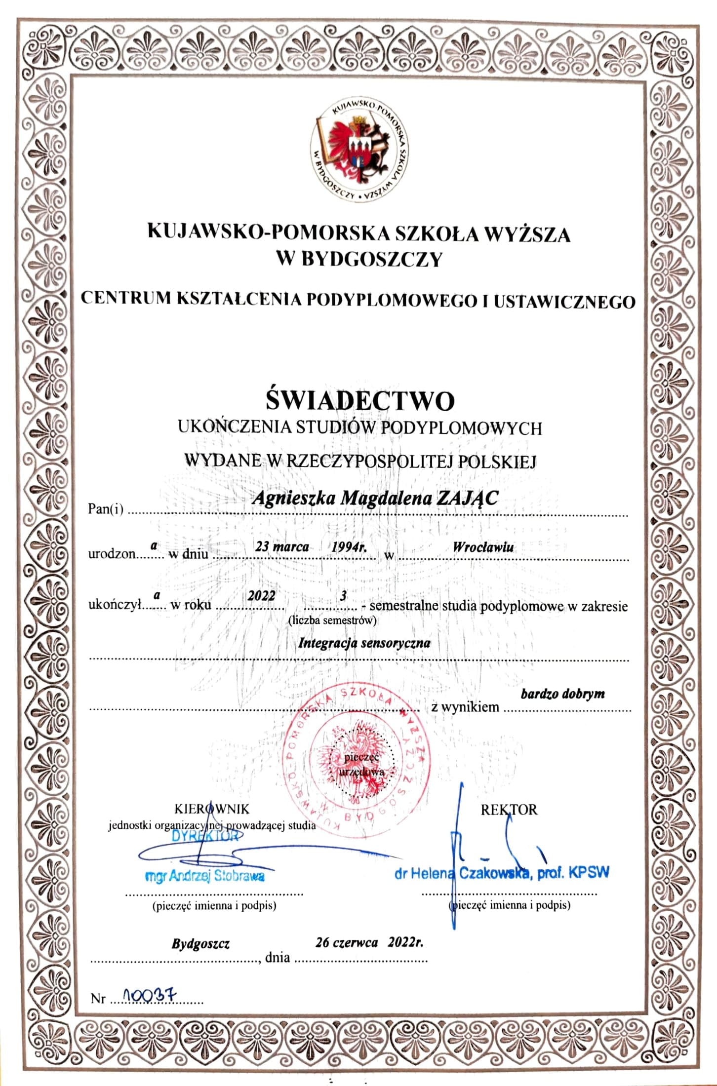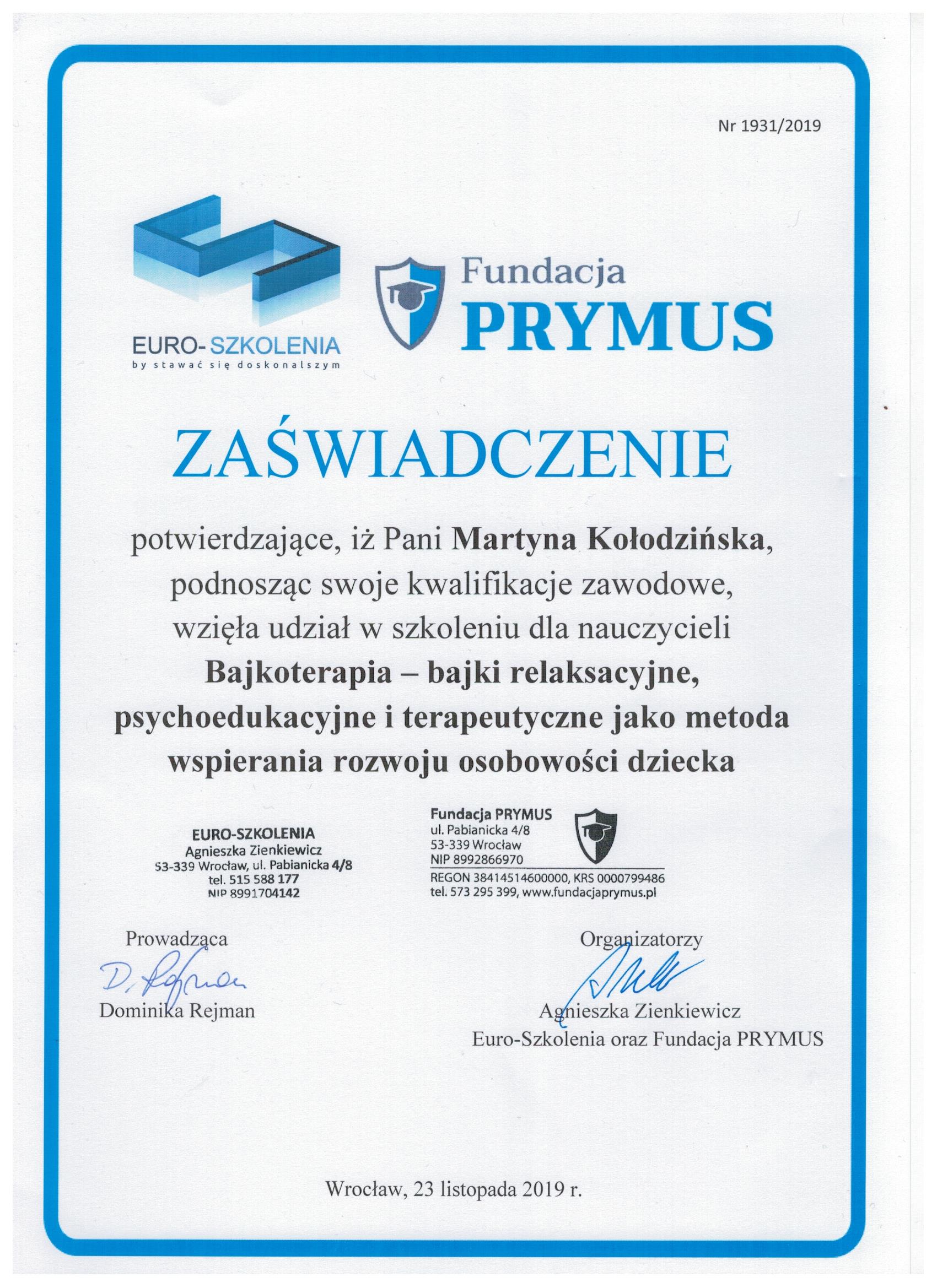 Jestem absolwentką Pedagogiki Specjalnej na Uniwersytecie Wrocławskim, o specjalności Edukacja i Rehabilitacja Osób z Niepełnosprawnością Intelektualną oraz Trenerką Sensoplastyki®, Bare FootTM, Treningu Kreatywnego RozwojuTM i Treningu Kreatywnego Wczesnego RozwojuTM . Pracę z dziećmi uwielbiam, dlatego wkładam w nią całe serce. Staram się ciągle poszerzać swoją wiedzę, aktualnie studiuję dodatkowo wczesne wspomaganie rozwoju dziecka. Uwielbiam zwiedzać ciekawe miejsca, czytać i spacerować z bliskimi.