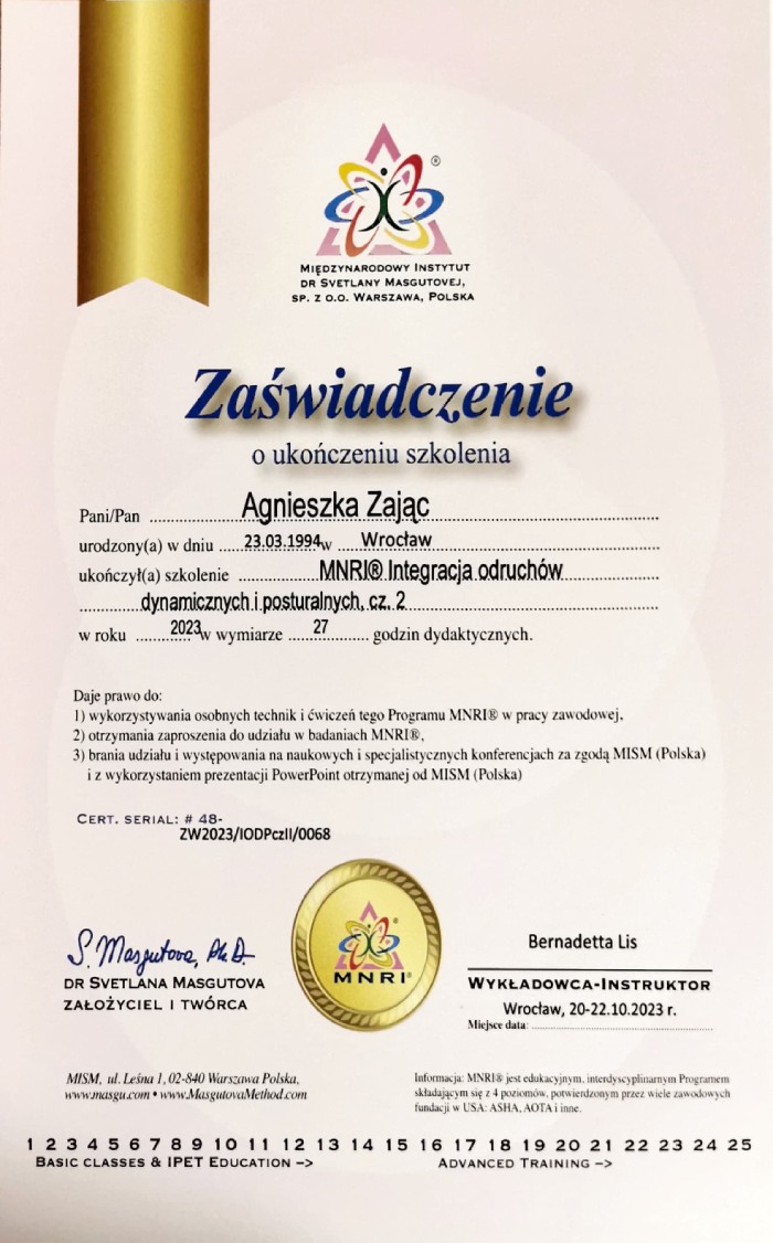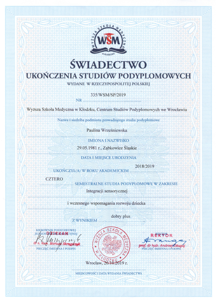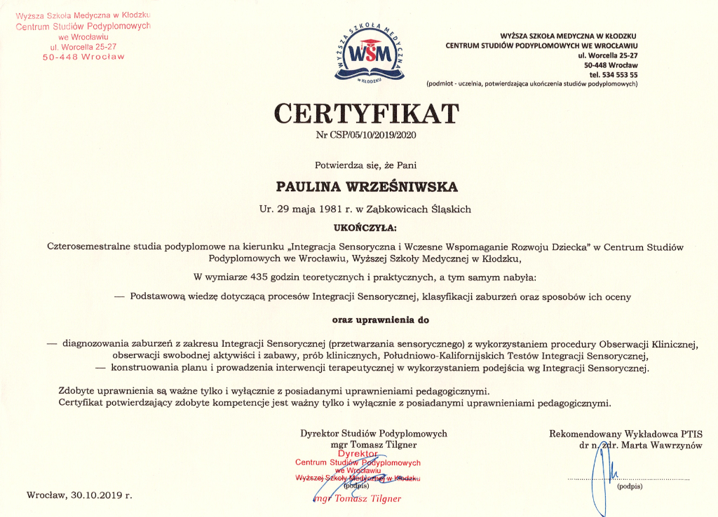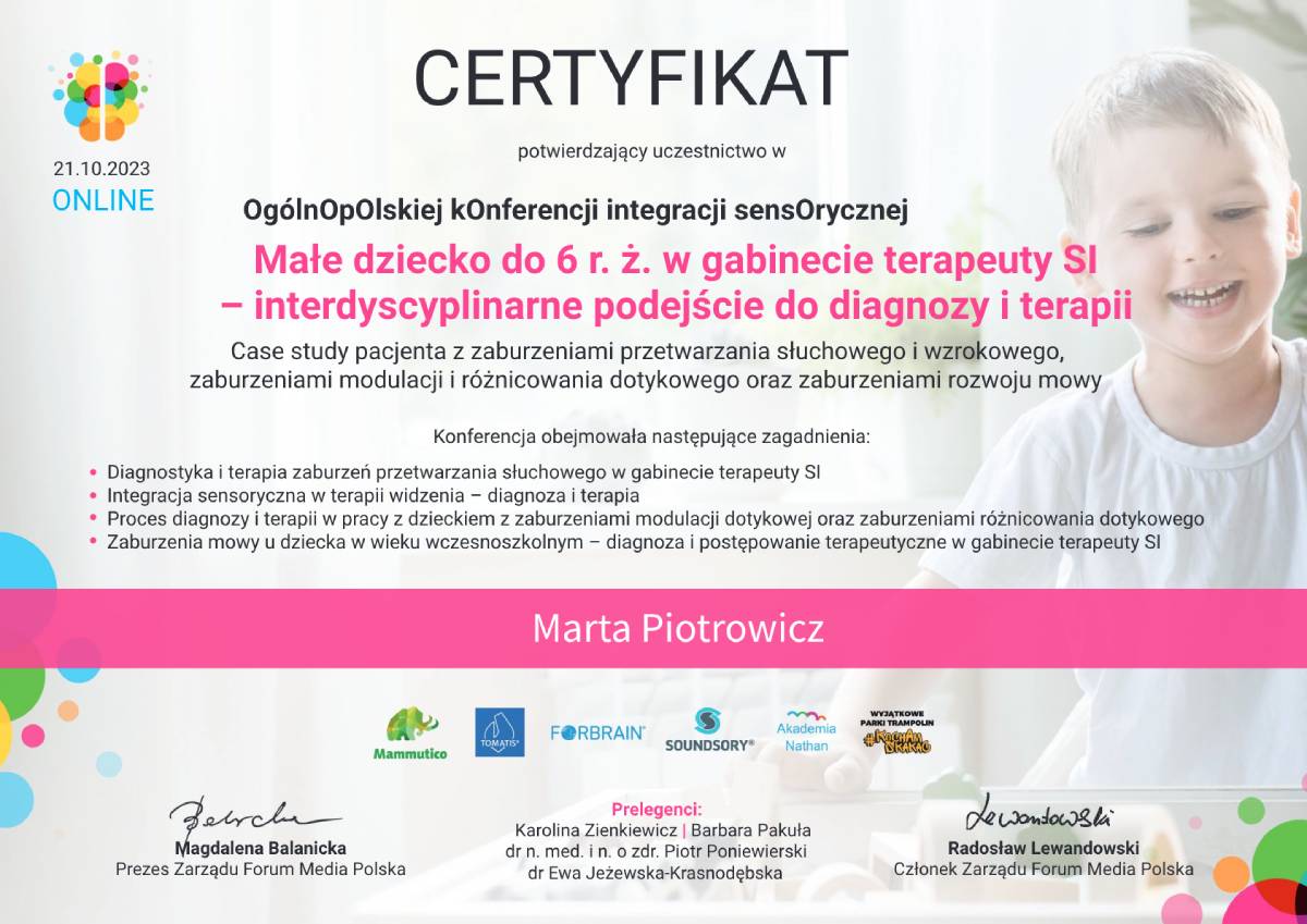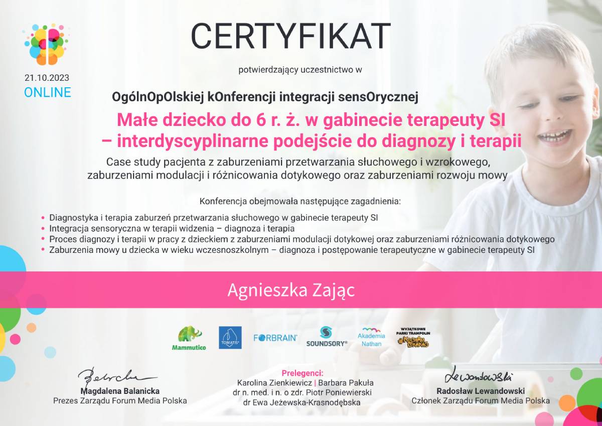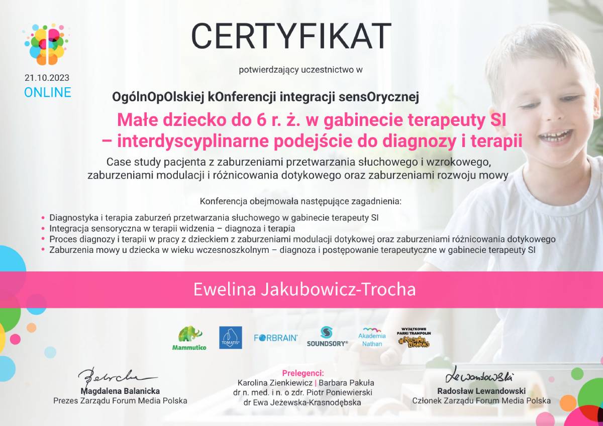 Jestem pedagogiem i terapeutą, specjalizującym się w pracy z dziećmi z zaburzeniami sensorycznymi oraz trudnościami motorycznymi. Ukończyłam studia podyplomowe w zakresie terapii SI oraz Terapii ręki. Praca z dziećmi jest dla mnie źródłem radości i motywacji.