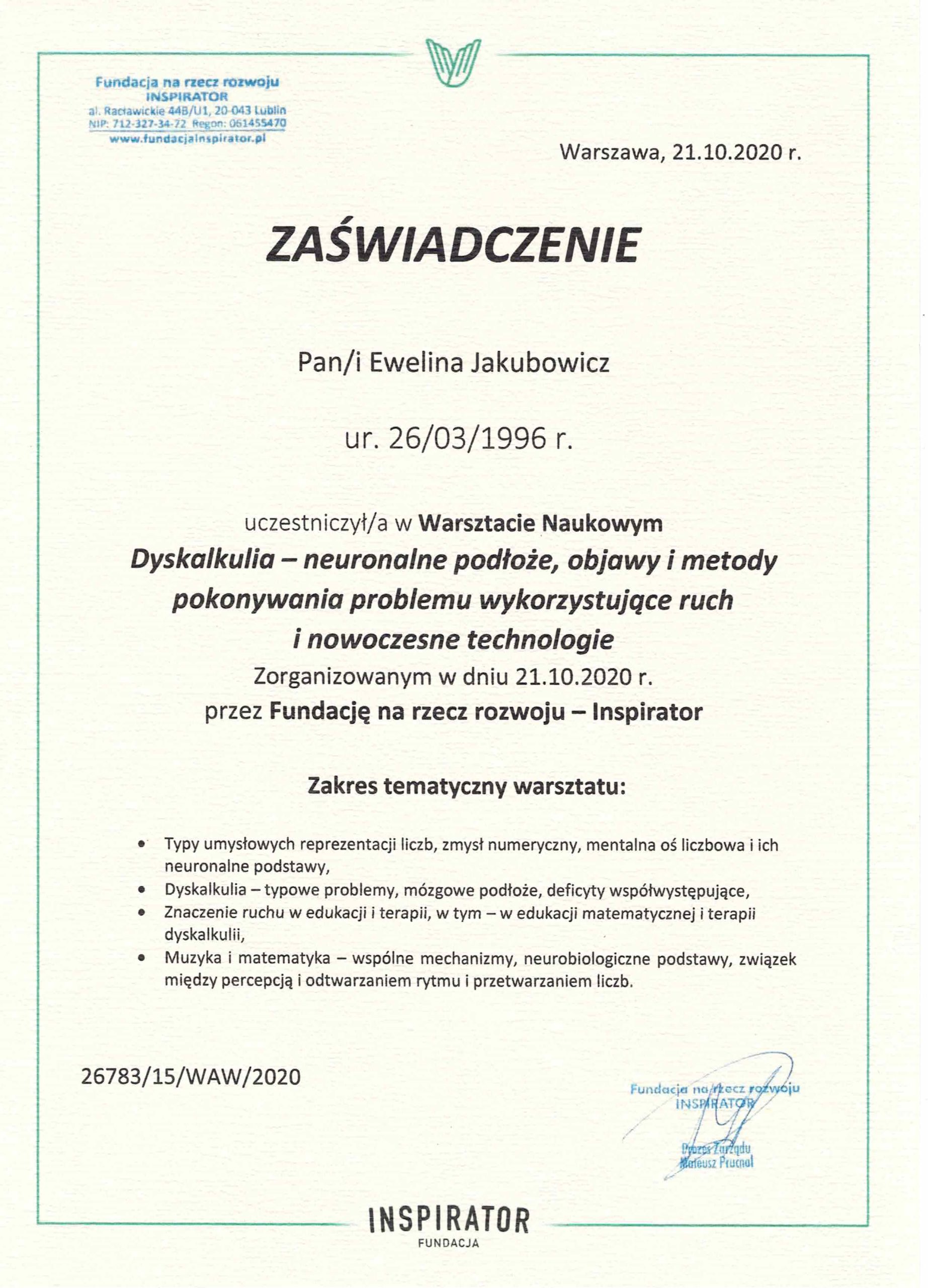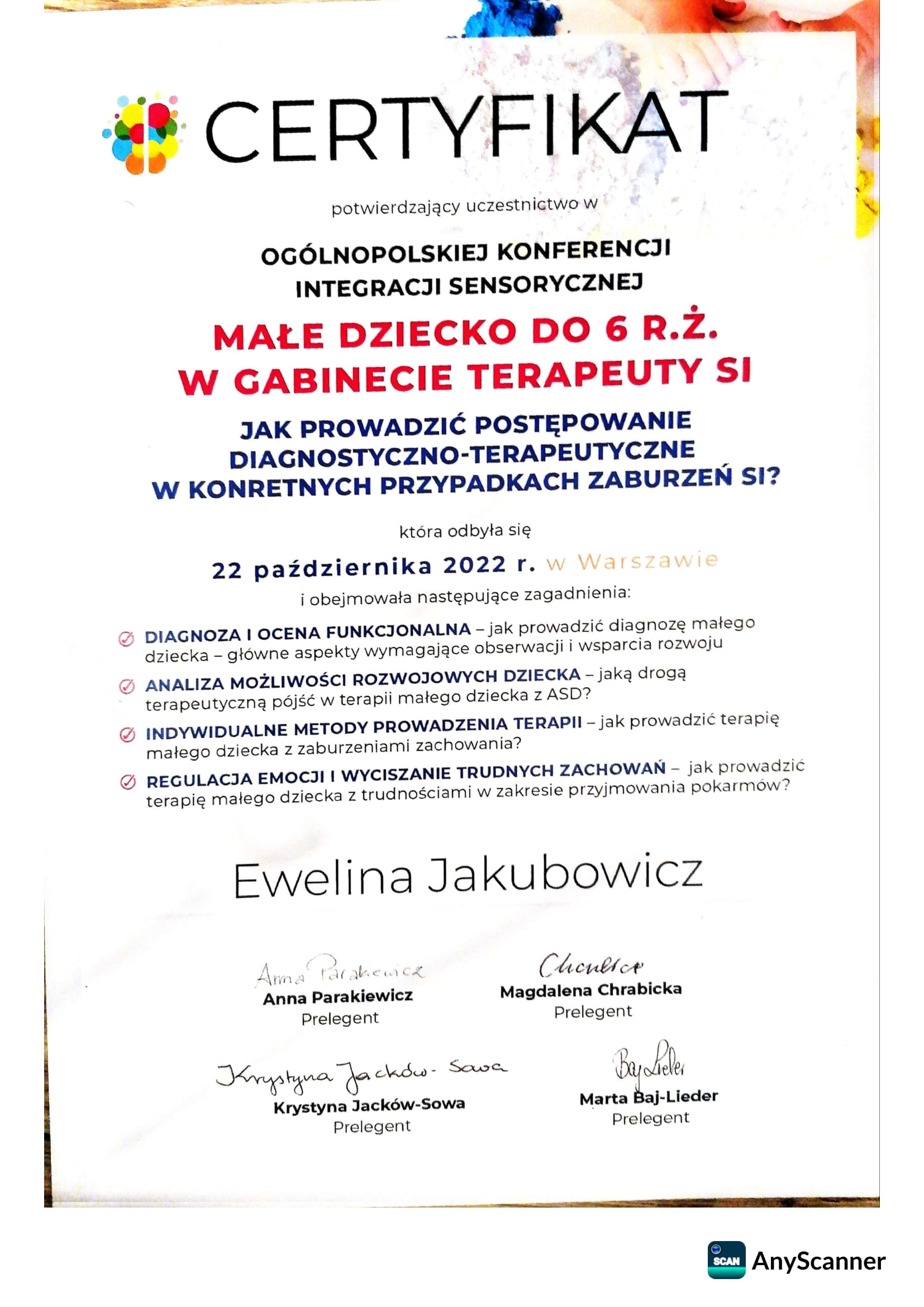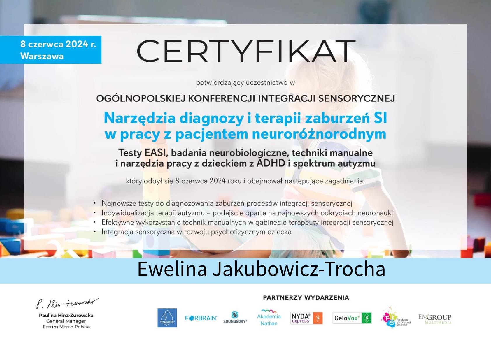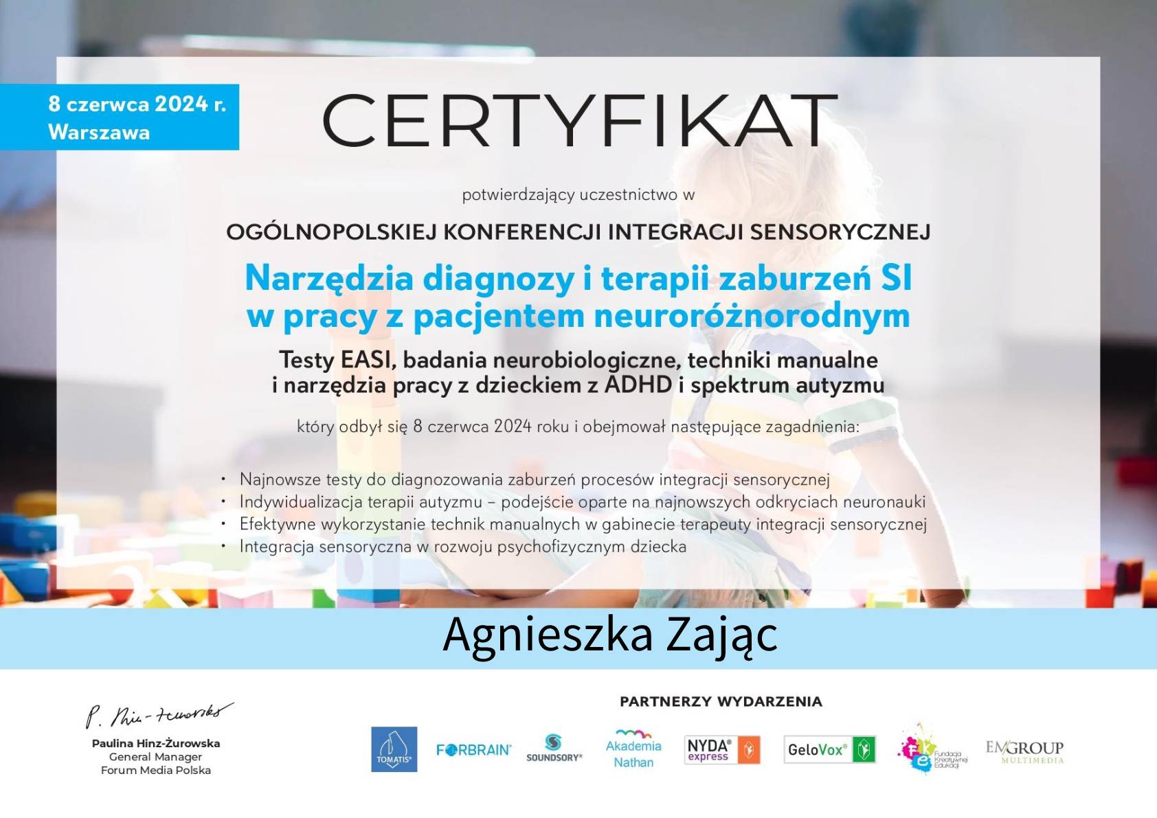 Jestem pedagogiem i terapeutą, specjalizującym się w pracy z dziećmi z zaburzeniami sensorycznymi oraz trudnościami motorycznymi. Ukończyłam studia podyplomowe w zakresie terapii SI oraz Terapii ręki. Praca z dziećmi jest dla mnie źródłem radości i motywacji.