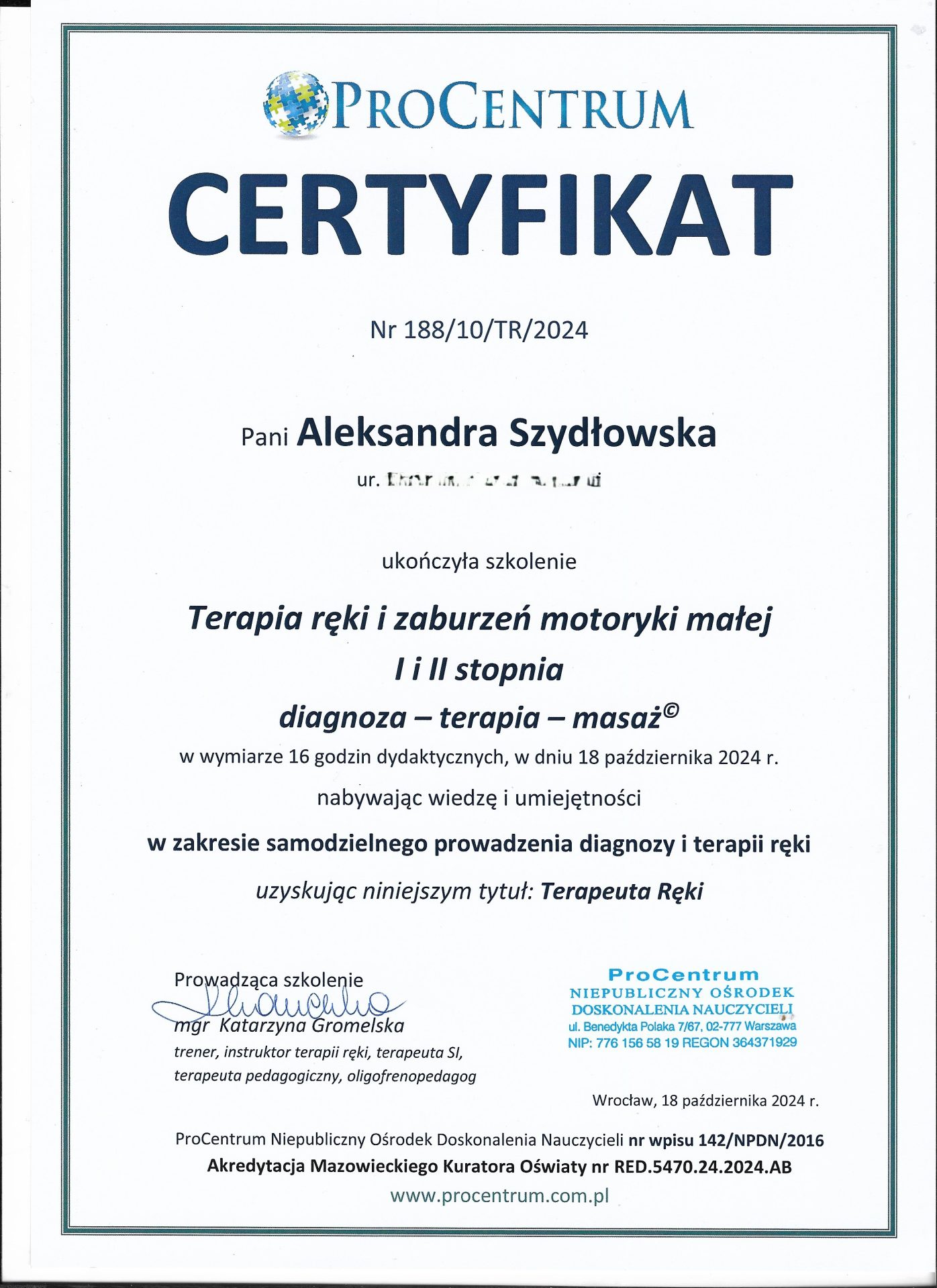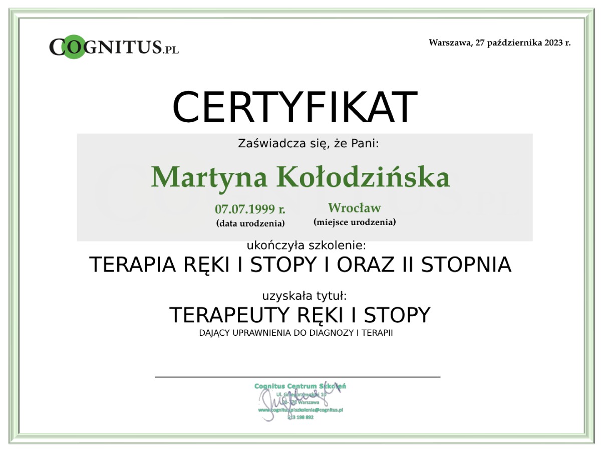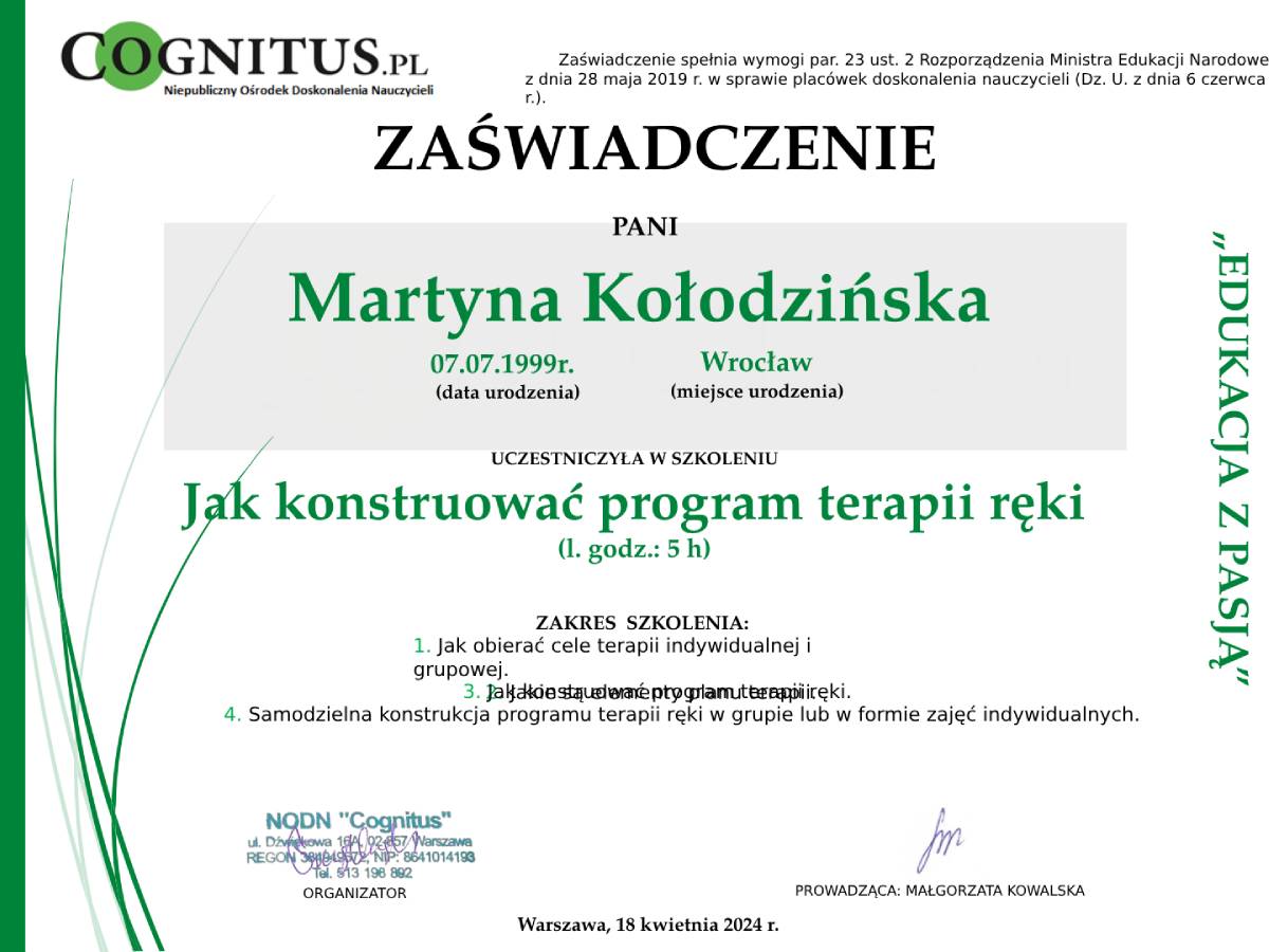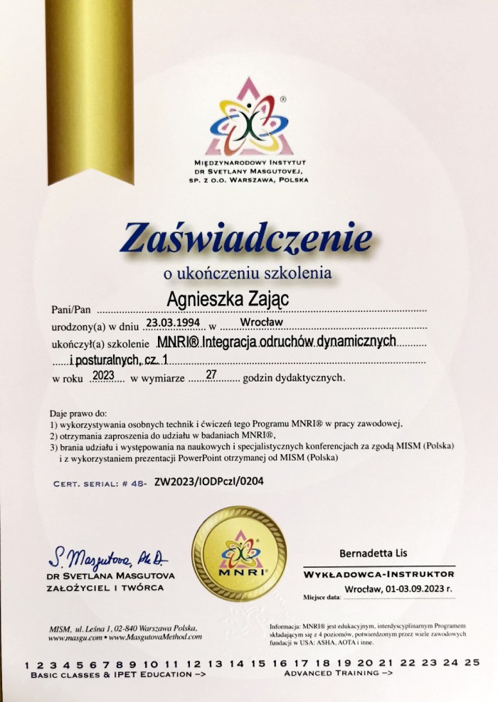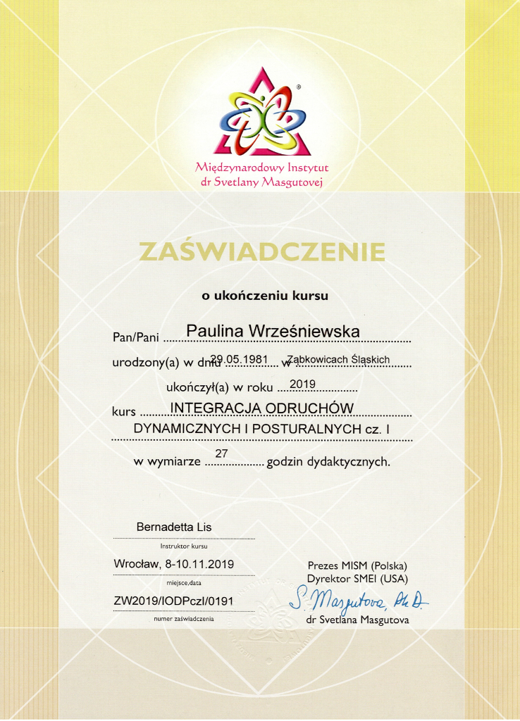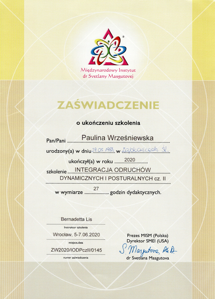 Jestem absolwentką kierunku Pedagogika Opiekuńcza z Terapią oraz studiów podyplomowych w zakresie Integracji Sensorycznej. Ukończyłam liczne kursy doskonalące, w tym szkolenia z terapii ręki, muzykoterapii integralnej (moduły I, II i III) oraz kurs Treningu Umiejętności Społecznych. Na co dzień pracuję w szkole, gdzie prowadzę również zajęcia terapeutyczne z zakresu terapii ręki. W czasie wolnym pasjonuję się bieganiem, czytaniem oraz grą na instrumentach etnicznych.