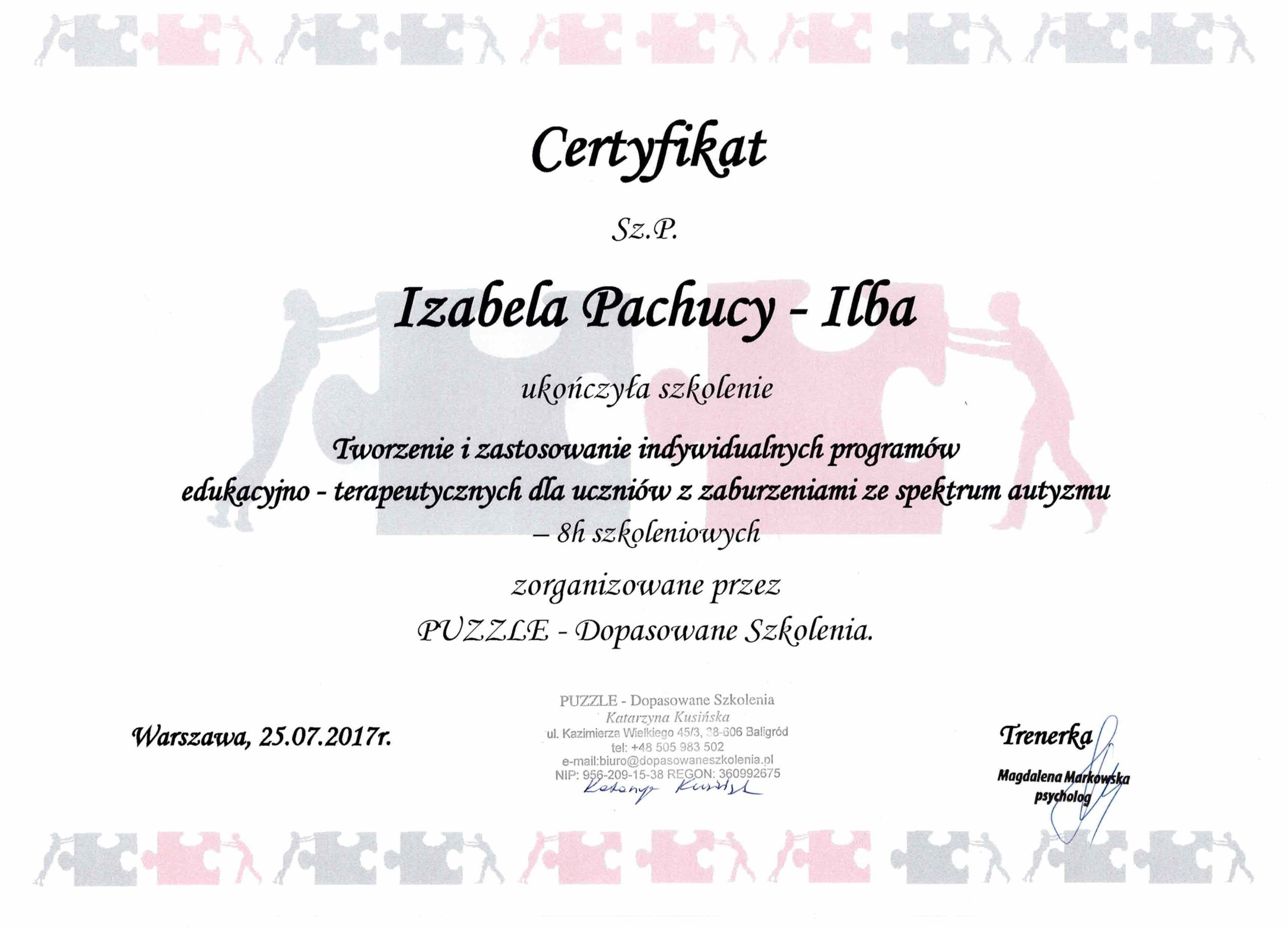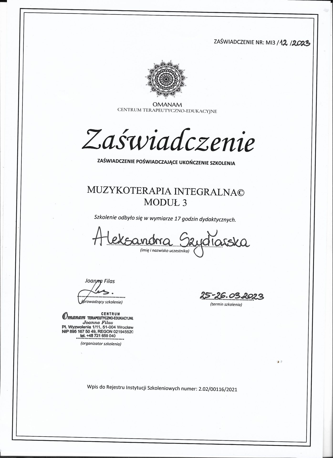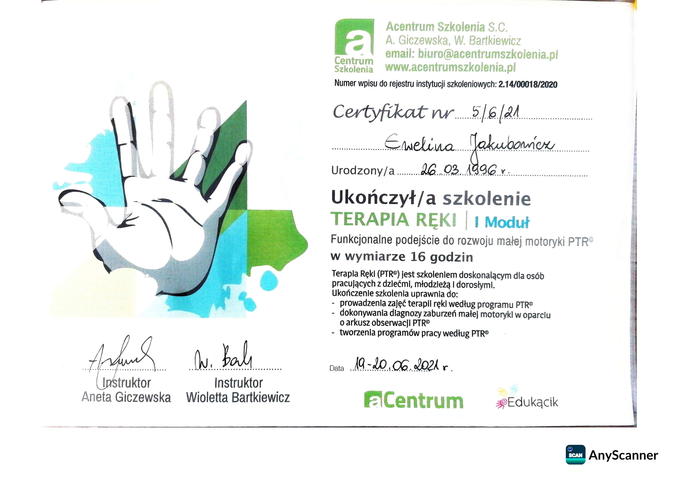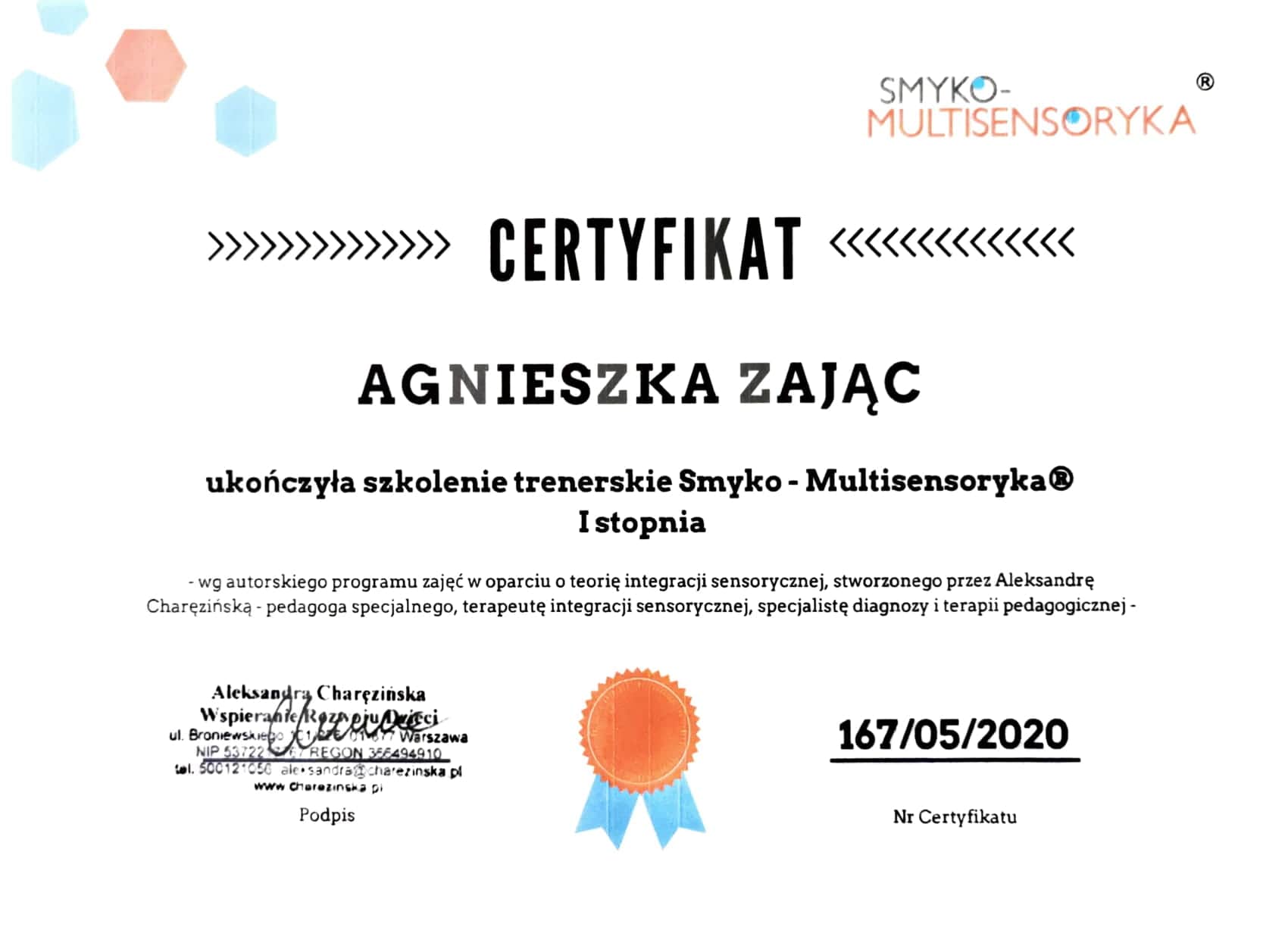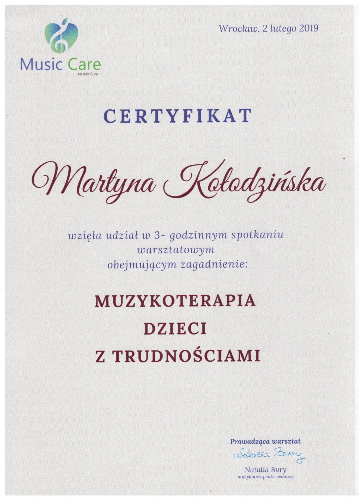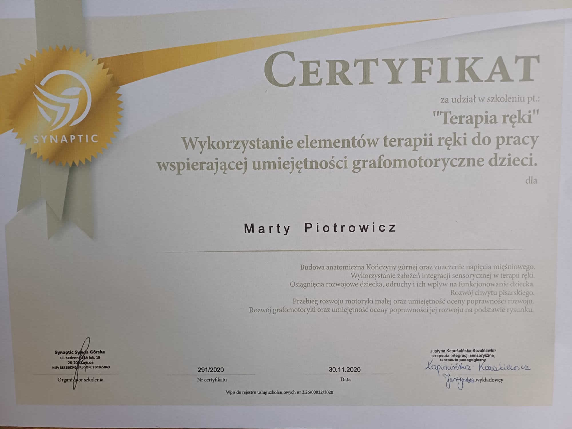 Jestem absolwentką kierunku Pedagogika Opiekuńcza z Terapią oraz studiów podyplomowych w zakresie Integracji Sensorycznej. Ukończyłam liczne kursy doskonalące, w tym szkolenia z terapii ręki, muzykoterapii integralnej (moduły I, II i III) oraz kurs Treningu Umiejętności Społecznych. Na co dzień pracuję w szkole, gdzie prowadzę również zajęcia terapeutyczne z zakresu terapii ręki. W czasie wolnym pasjonuję się bieganiem, czytaniem oraz grą na instrumentach etnicznych.