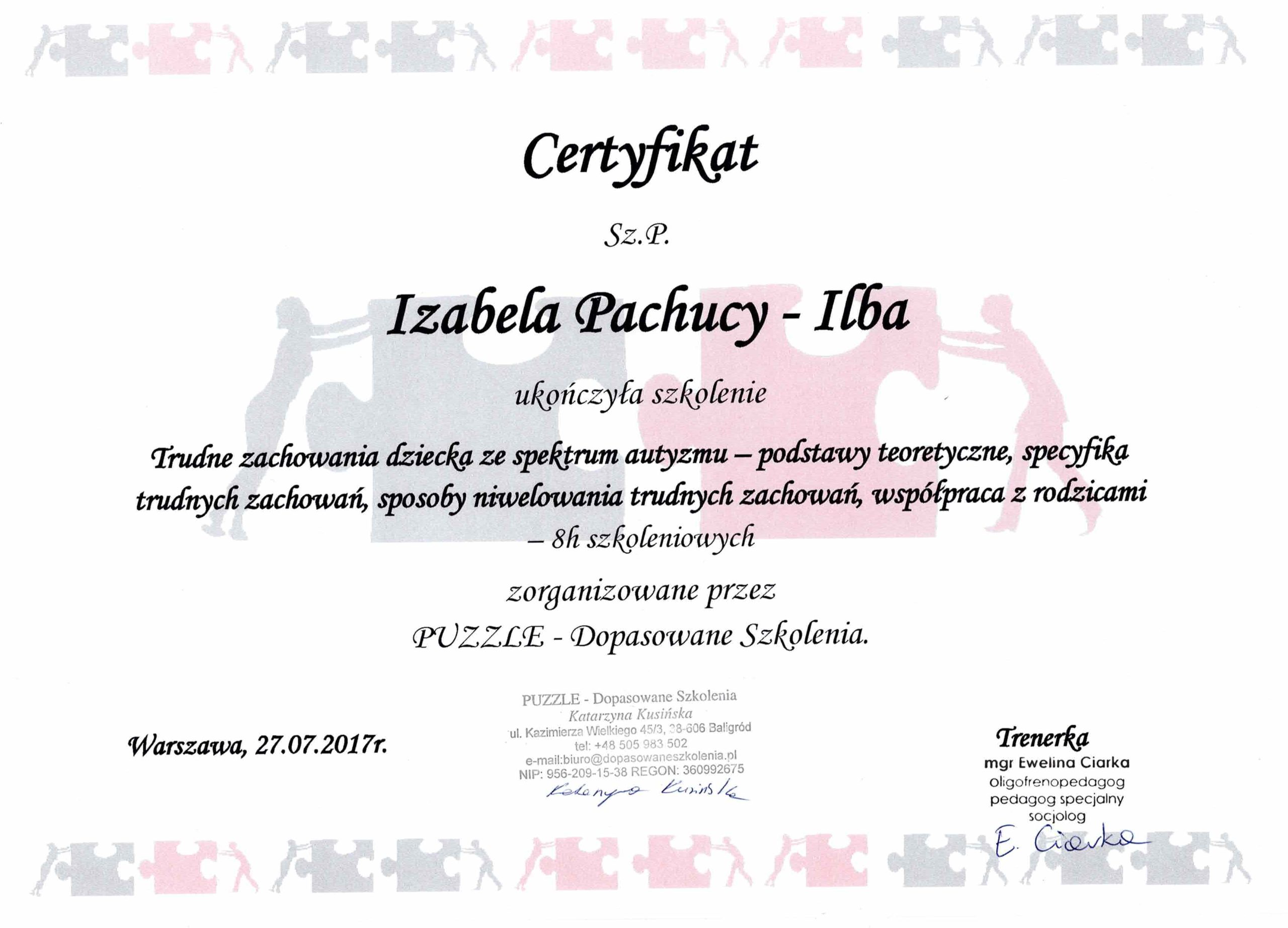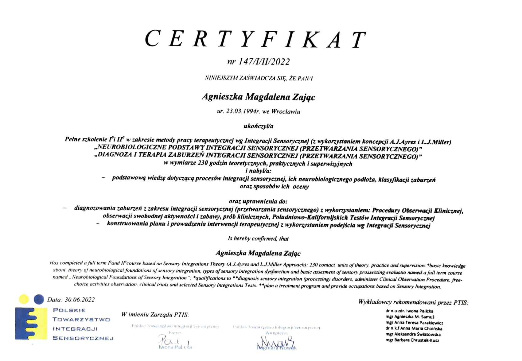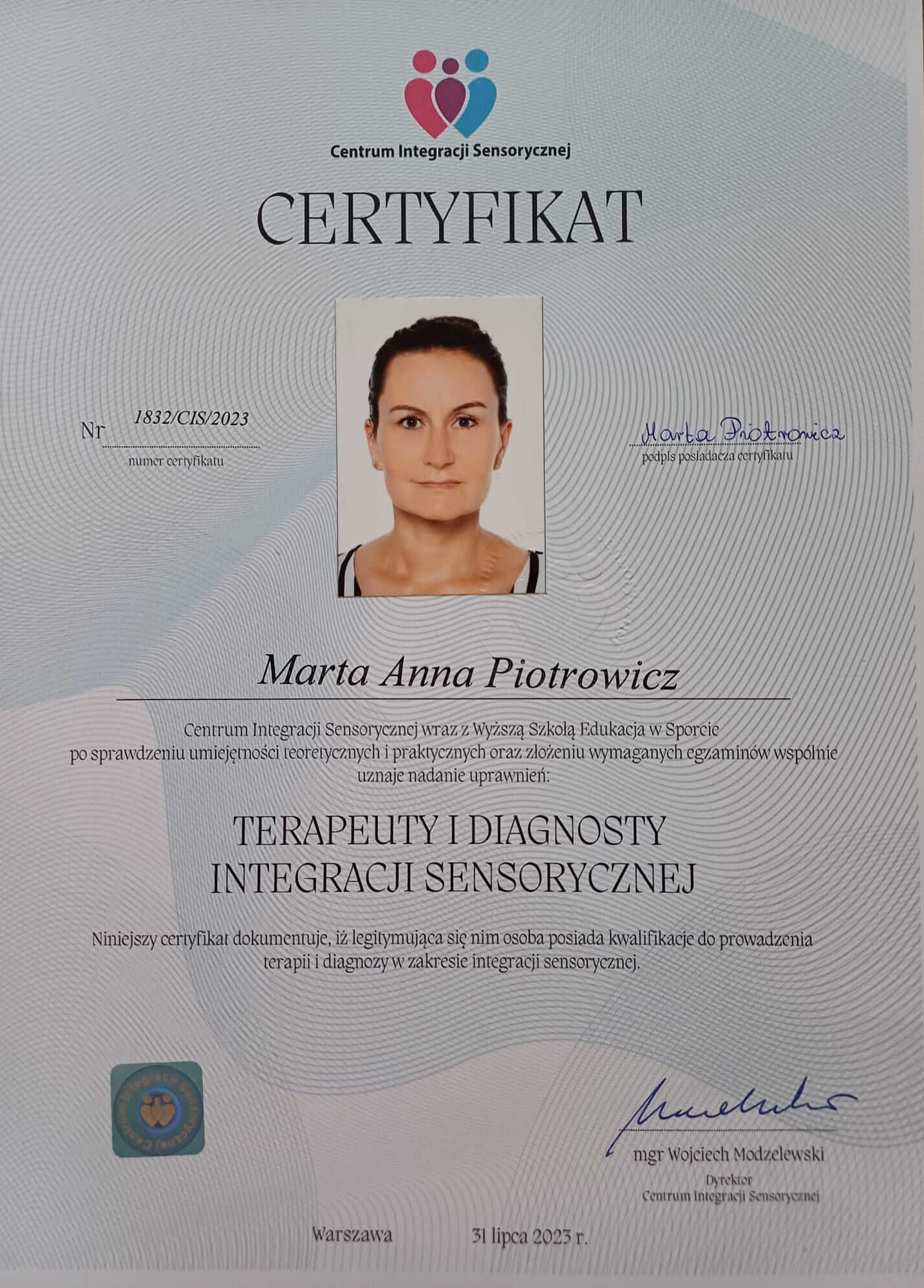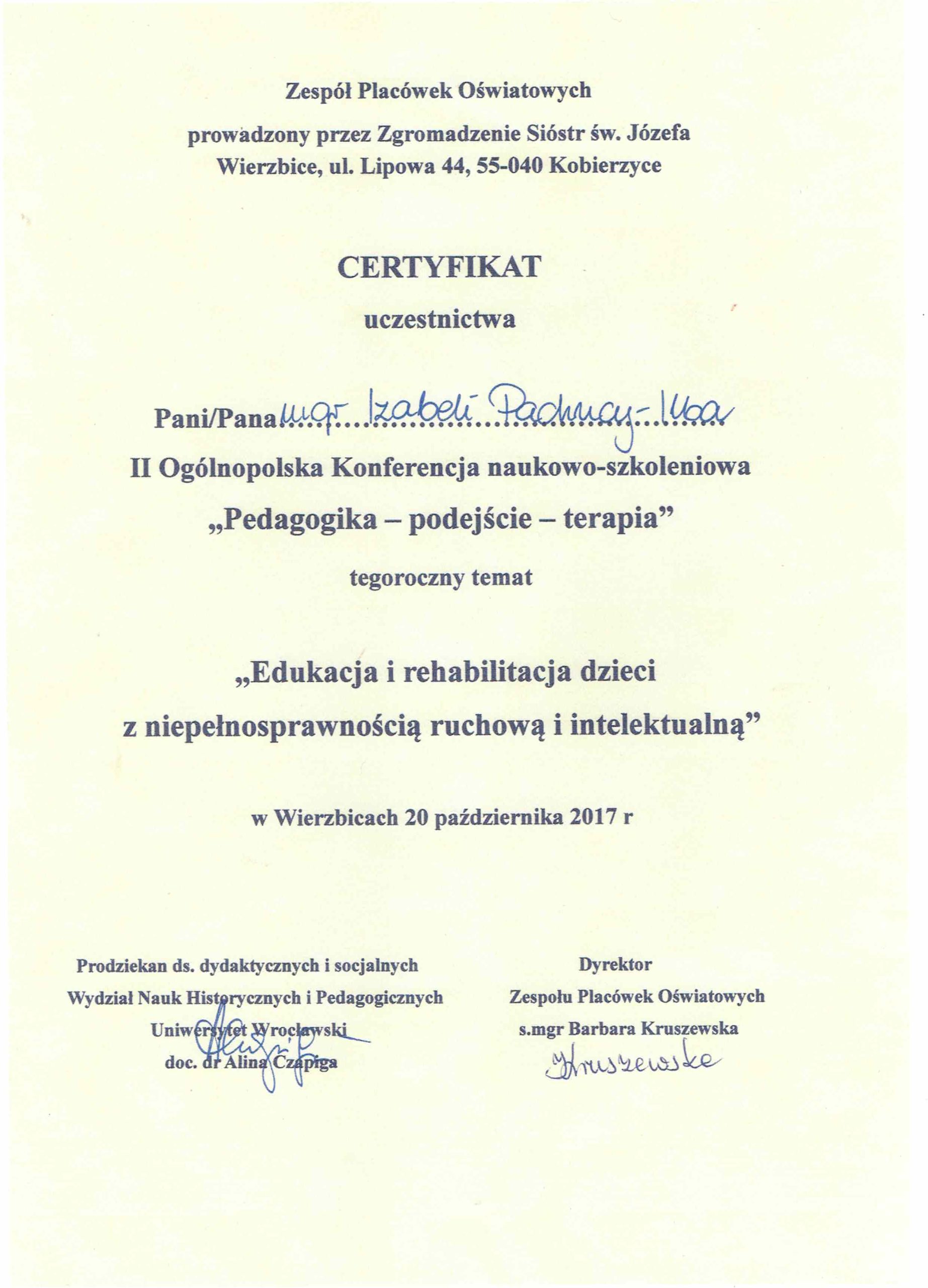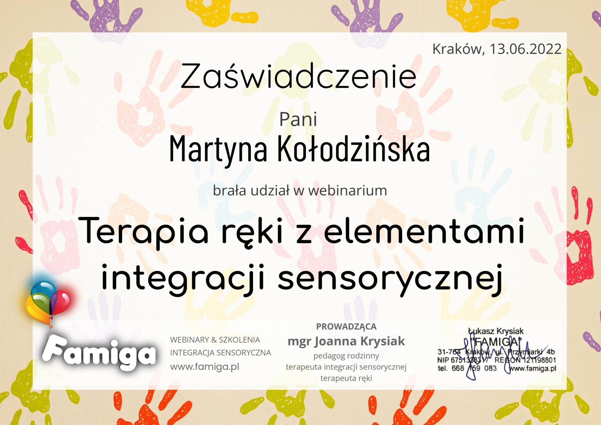 Jestem absolwentką kierunku Pedagogika Opiekuńcza z Terapią oraz studiów podyplomowych w zakresie Integracji Sensorycznej. Ukończyłam liczne kursy doskonalące, w tym szkolenia z terapii ręki, muzykoterapii integralnej (moduły I, II i III) oraz kurs Treningu Umiejętności Społecznych. Na co dzień pracuję w szkole, gdzie prowadzę również zajęcia terapeutyczne z zakresu terapii ręki. W czasie wolnym pasjonuję się bieganiem, czytaniem oraz grą na instrumentach etnicznych.