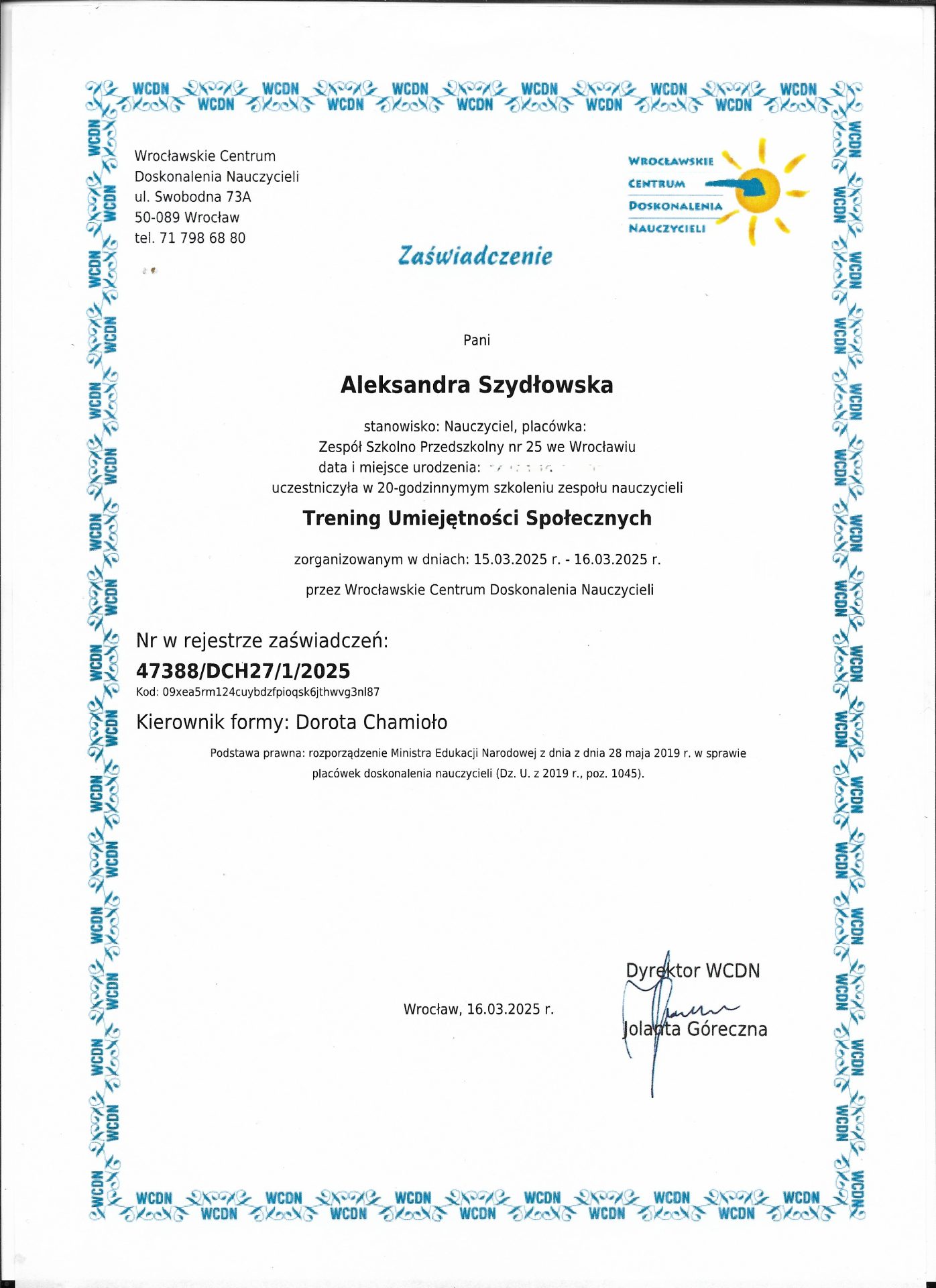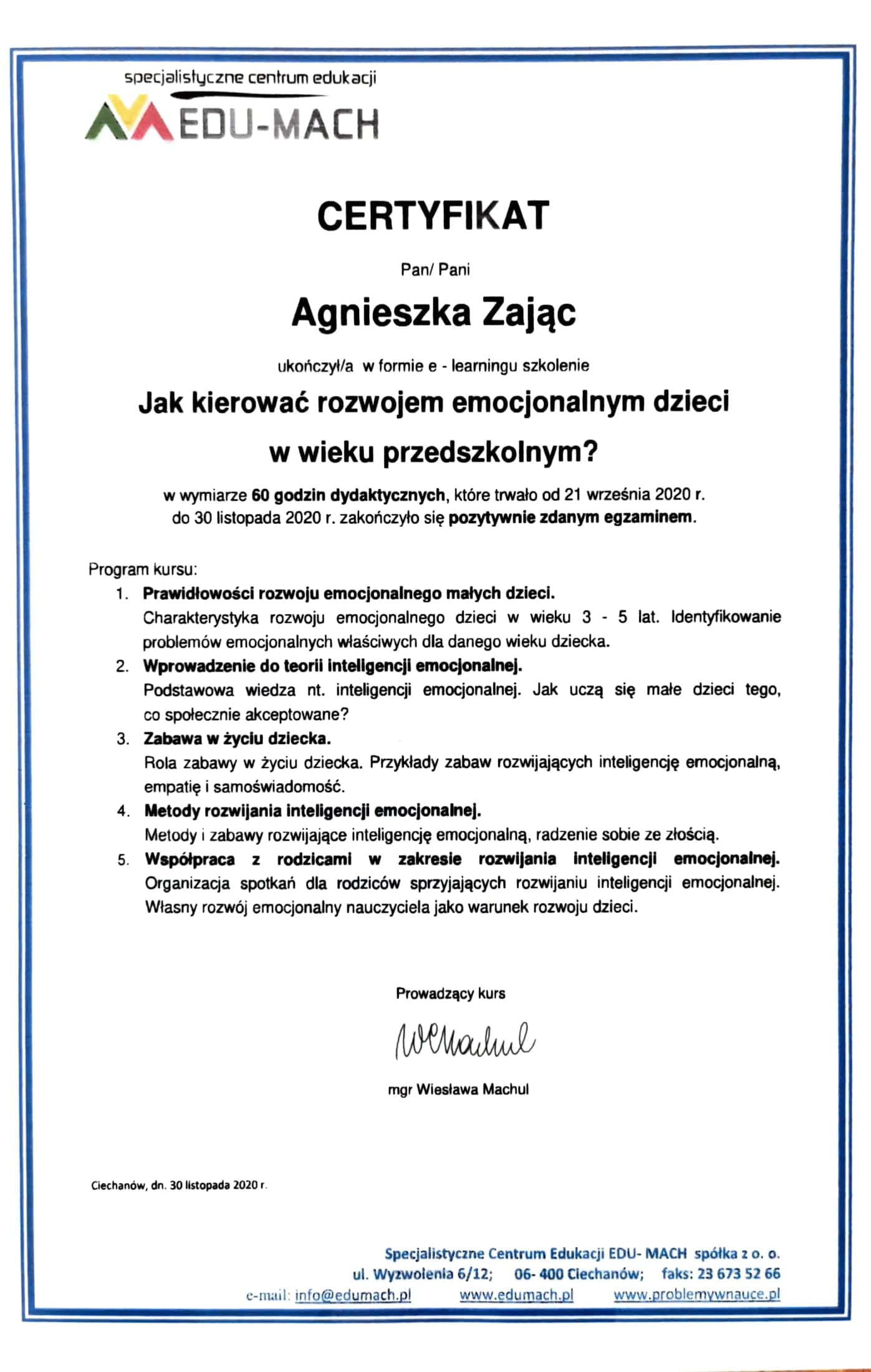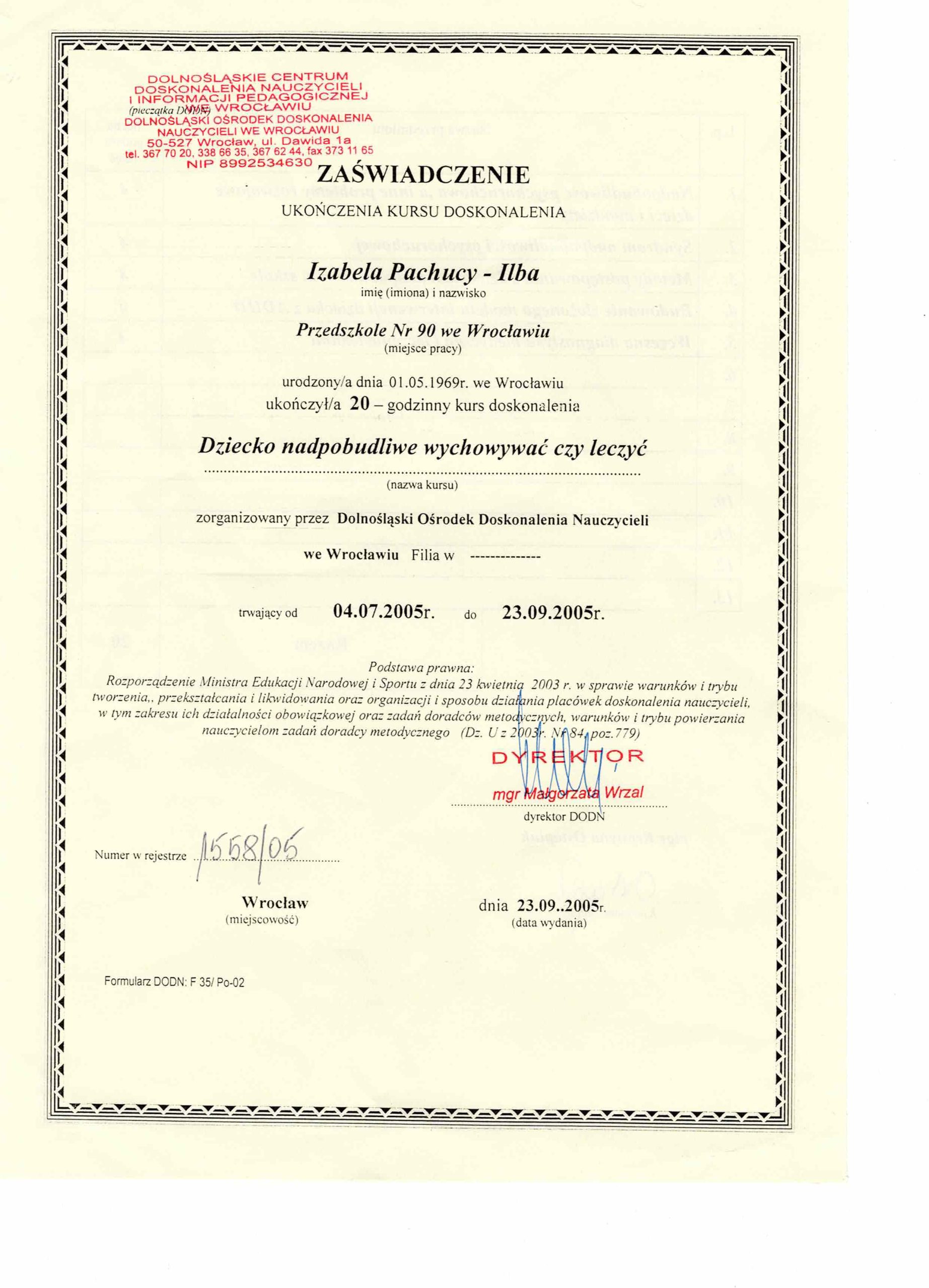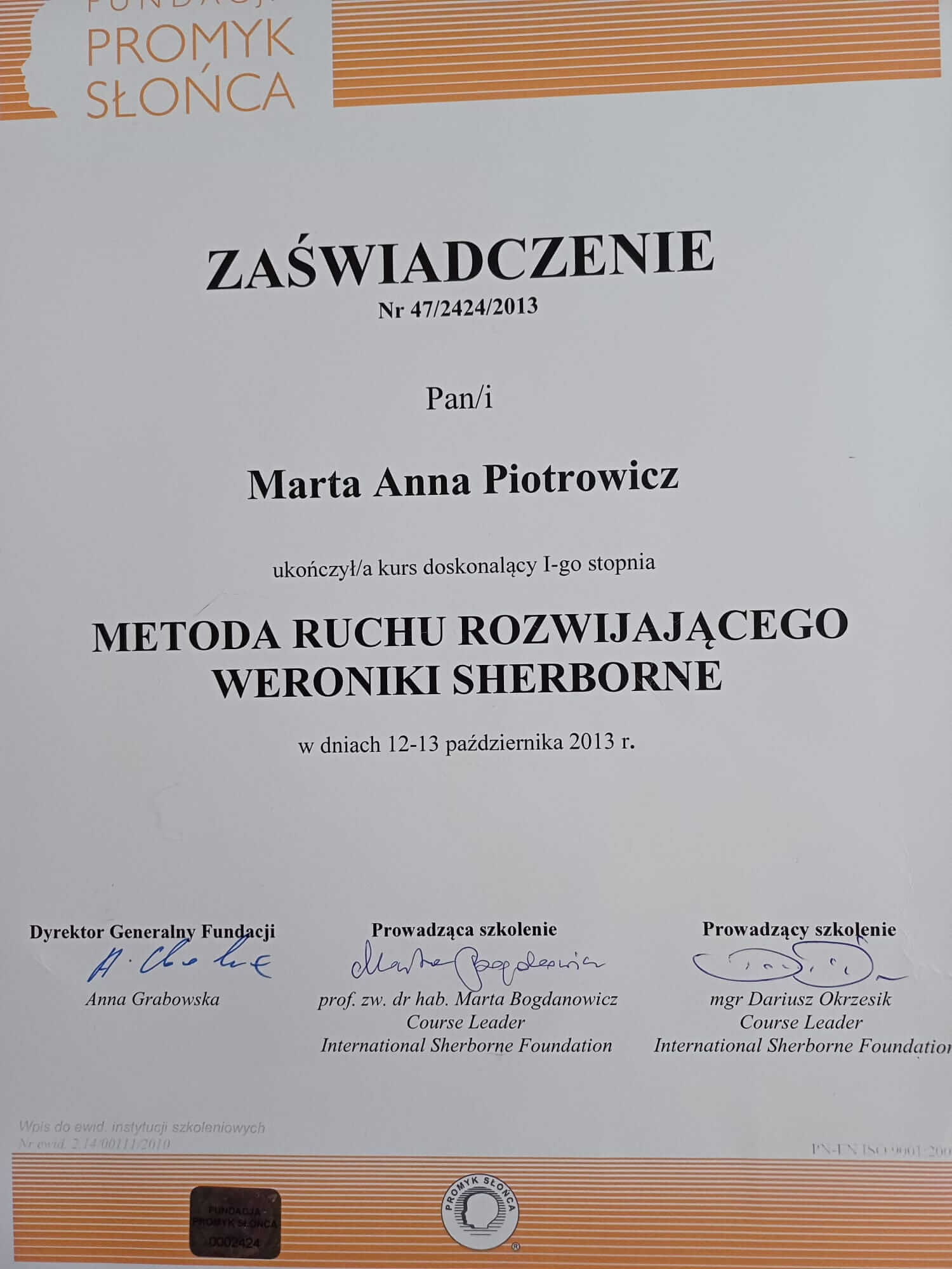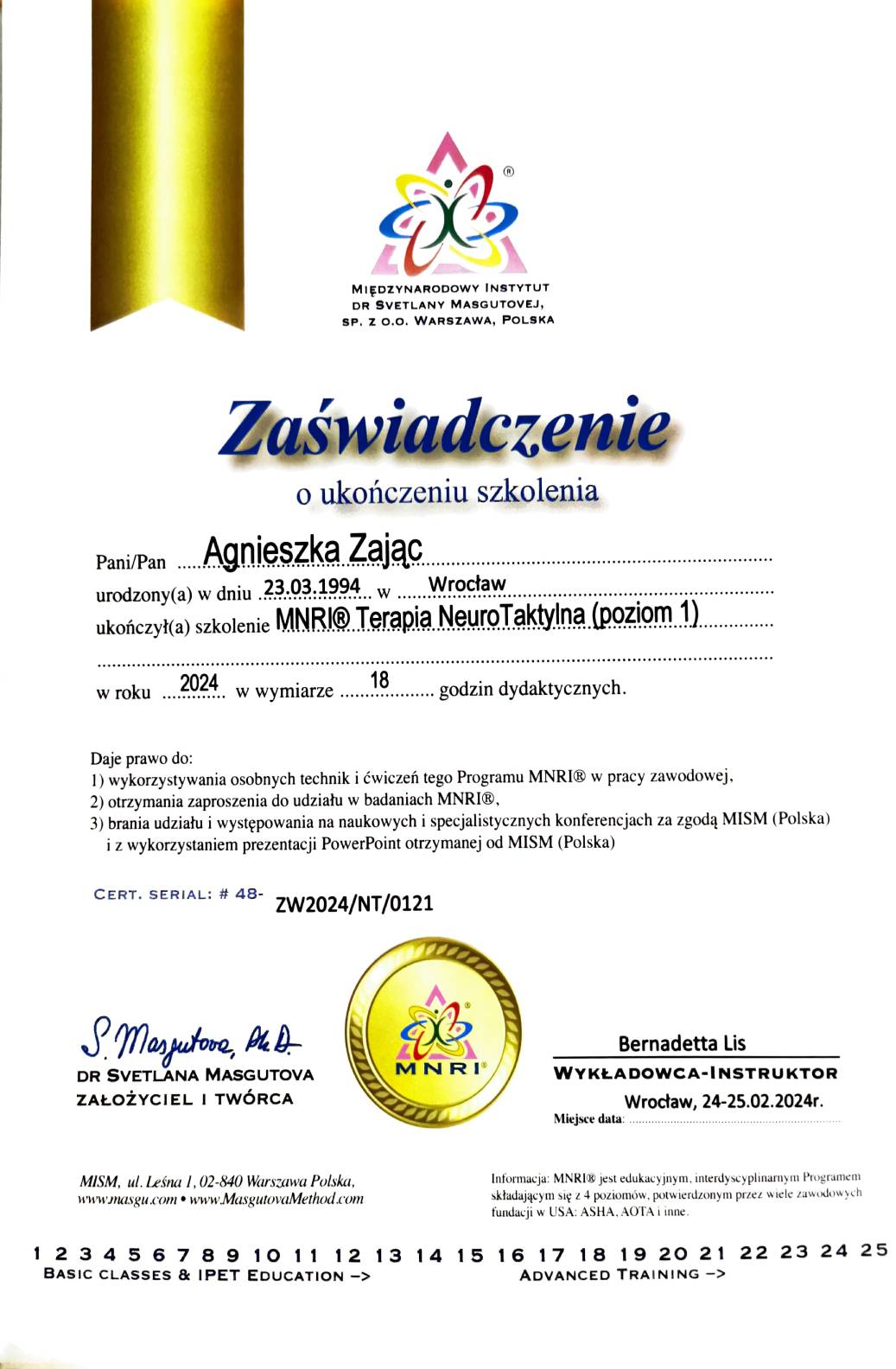 Jestem absolwentką kierunku Pedagogika Opiekuńcza z Terapią oraz studiów podyplomowych w zakresie Integracji Sensorycznej. Ukończyłam liczne kursy doskonalące, w tym szkolenia z terapii ręki, muzykoterapii integralnej (moduły I, II i III) oraz kurs Treningu Umiejętności Społecznych. Na co dzień pracuję w szkole, gdzie prowadzę również zajęcia terapeutyczne z zakresu terapii ręki. W czasie wolnym pasjonuję się bieganiem, czytaniem oraz grą na instrumentach etnicznych.