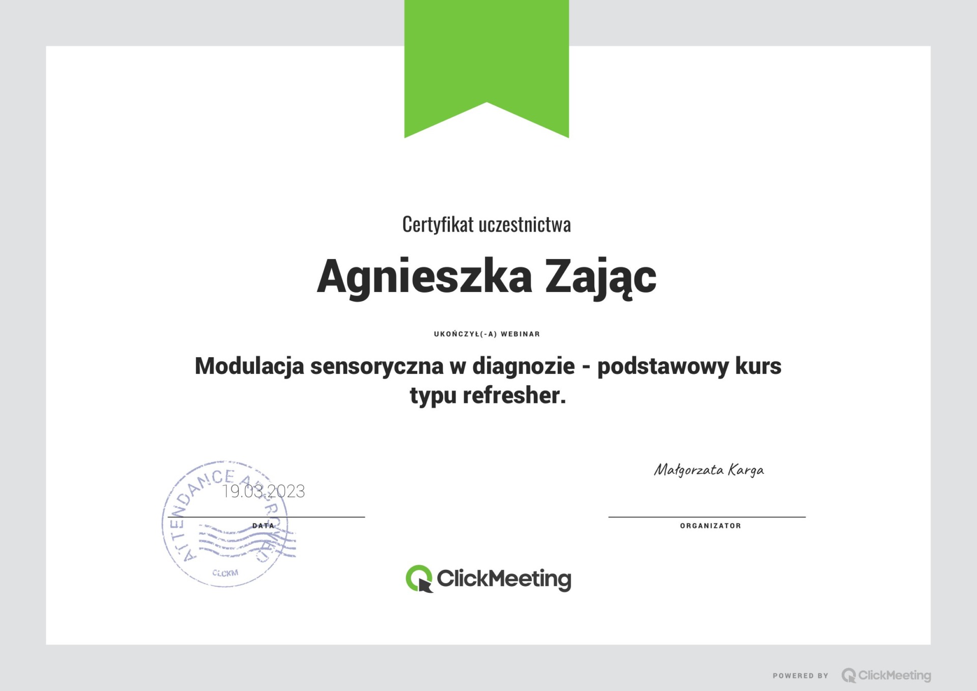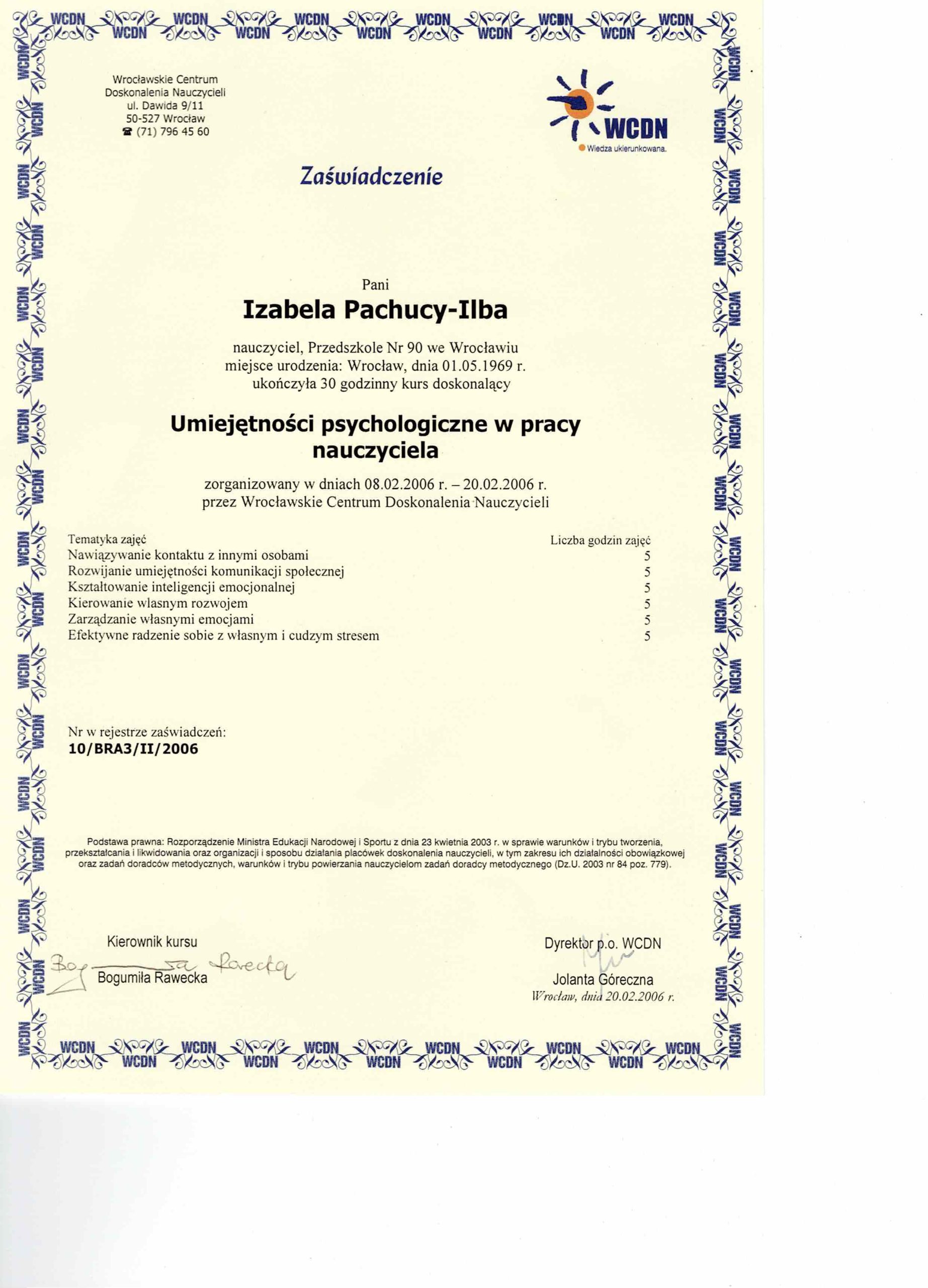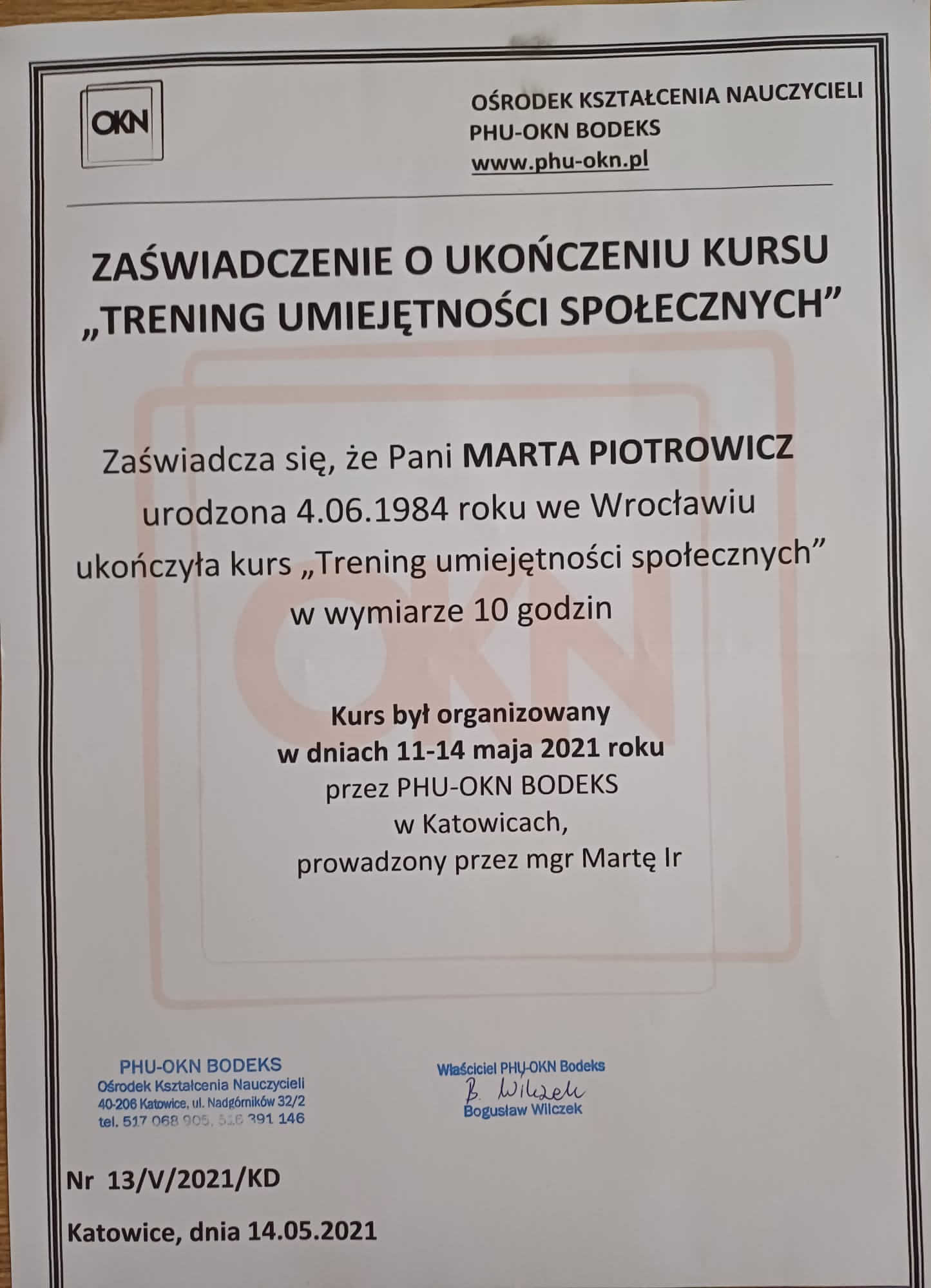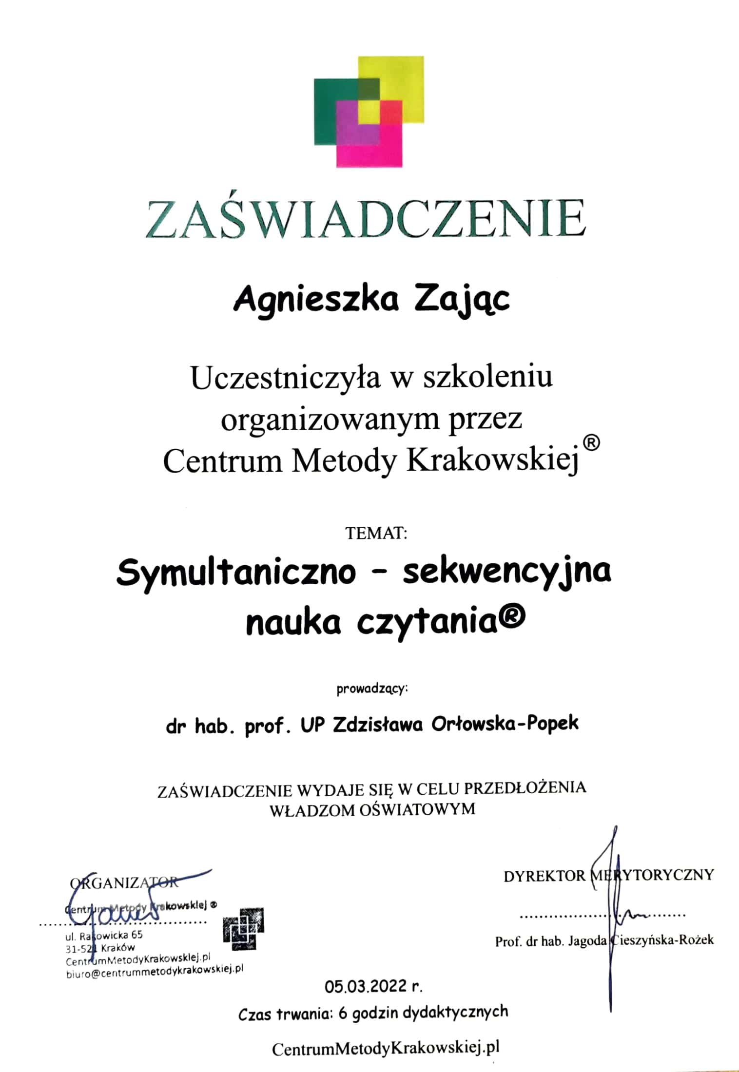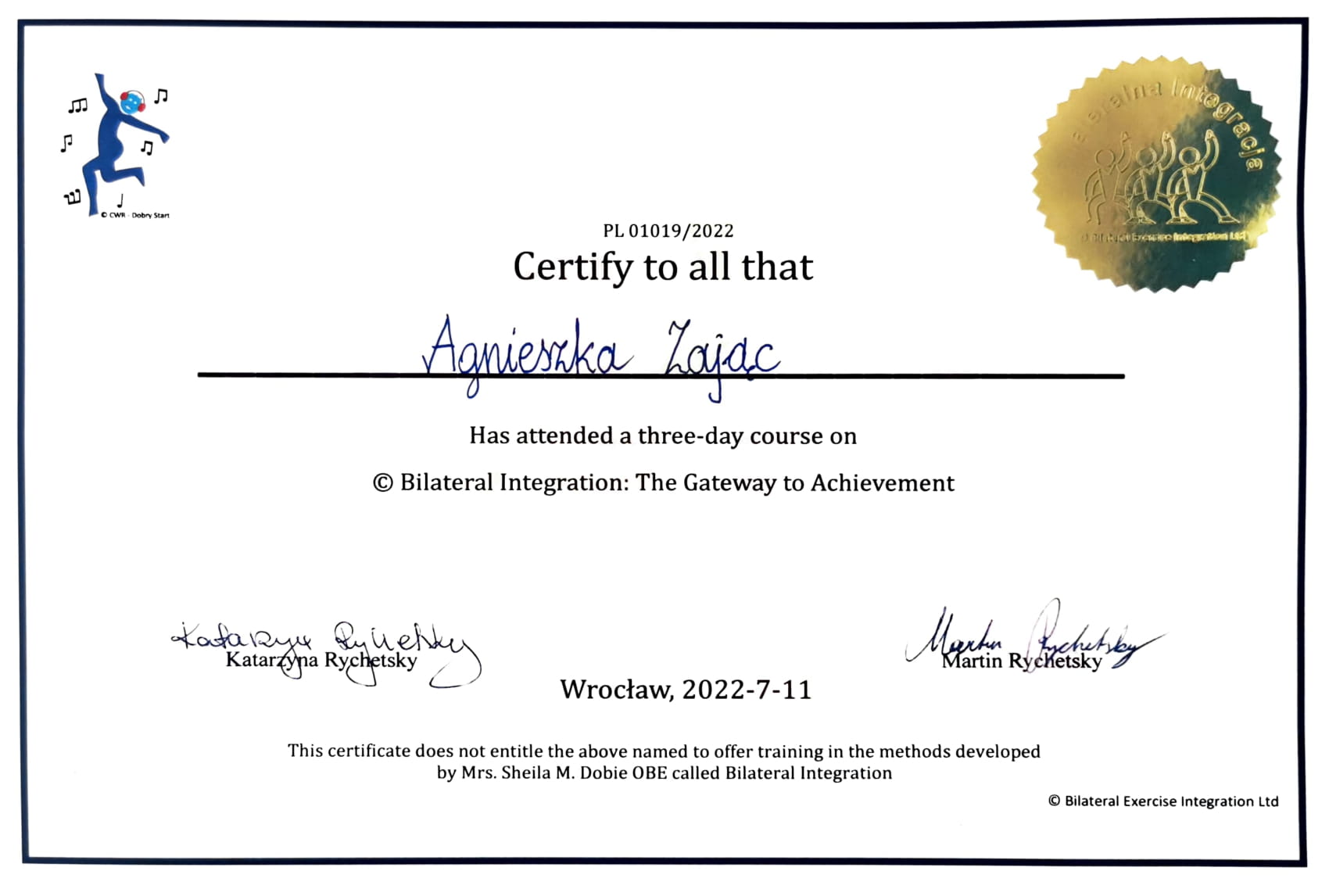 Jestem absolwentką kierunku Pedagogika Opiekuńcza z Terapią oraz studiów podyplomowych w zakresie Integracji Sensorycznej. Ukończyłam liczne kursy doskonalące, w tym szkolenia z terapii ręki, muzykoterapii integralnej (moduły I, II i III) oraz kurs Treningu Umiejętności Społecznych. Na co dzień pracuję w szkole, gdzie prowadzę również zajęcia terapeutyczne z zakresu terapii ręki. W czasie wolnym pasjonuję się bieganiem, czytaniem oraz grą na instrumentach etnicznych.