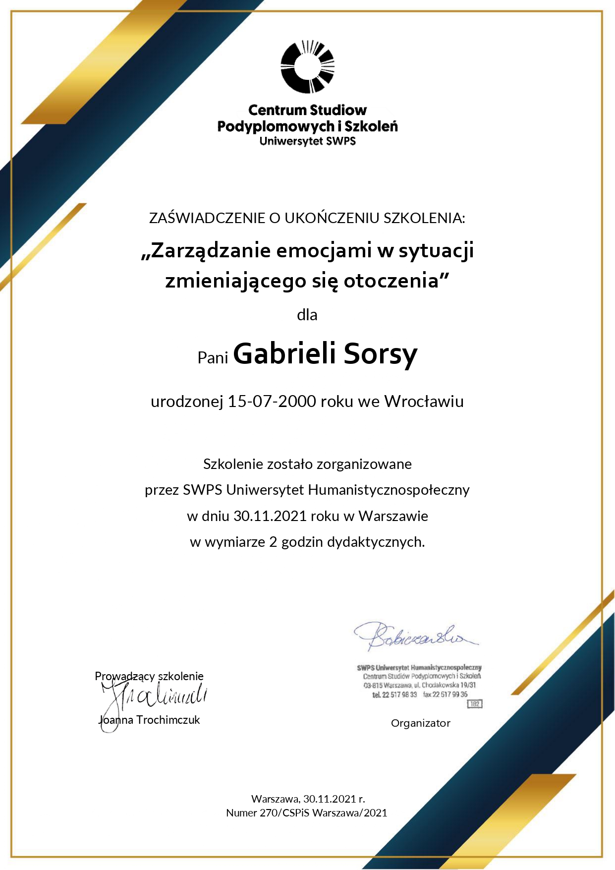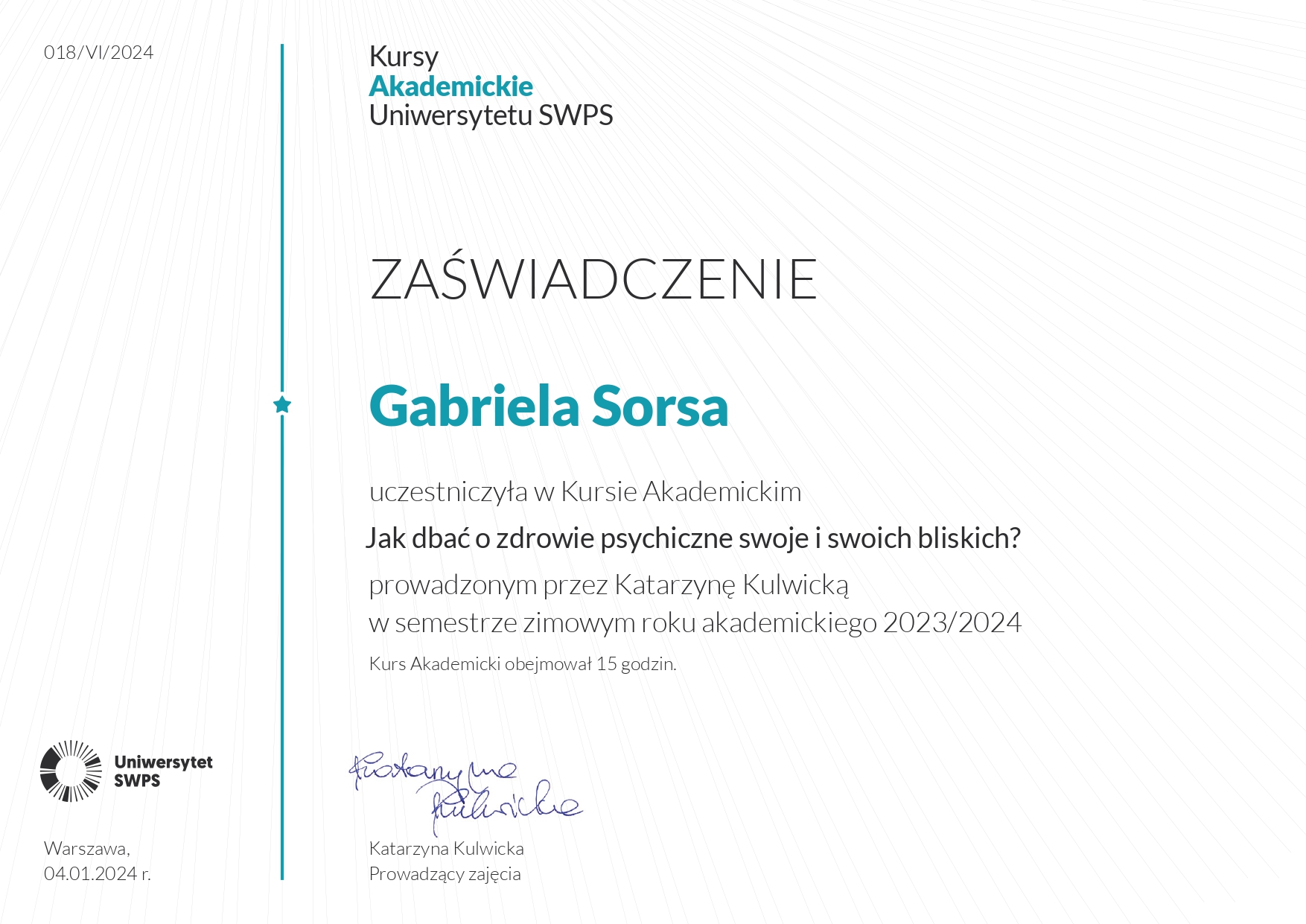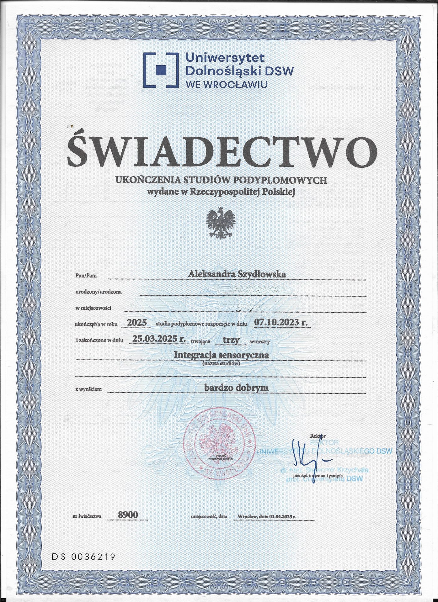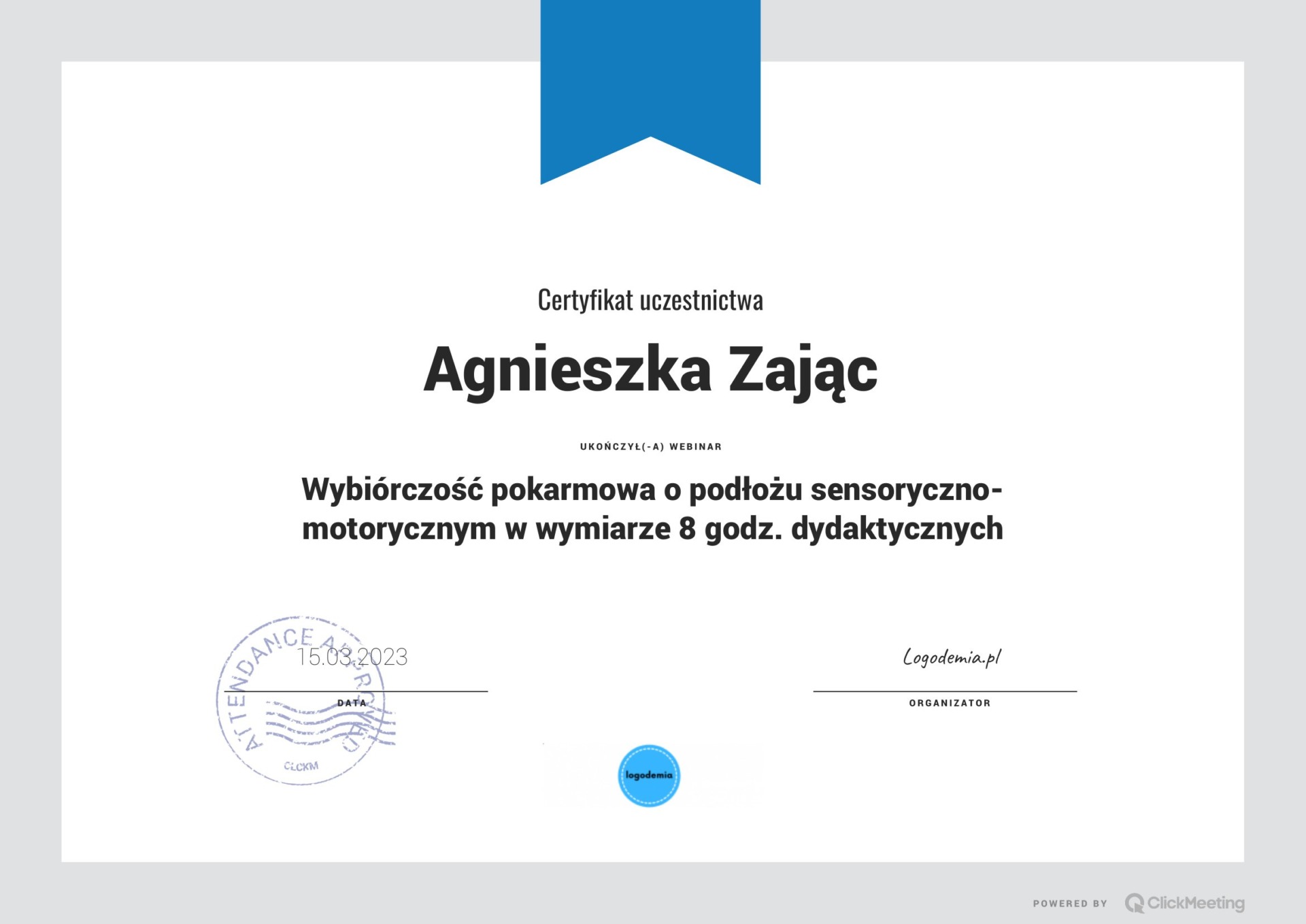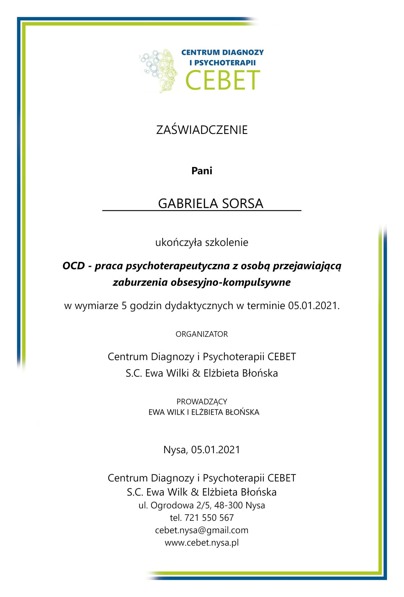 Jestem absolwentką kierunku Pedagogika Opiekuńcza z Terapią oraz studiów podyplomowych w zakresie Integracji Sensorycznej. Ukończyłam liczne kursy doskonalące, w tym szkolenia z terapii ręki, muzykoterapii integralnej (moduły I, II i III) oraz kurs Treningu Umiejętności Społecznych. Na co dzień pracuję w szkole, gdzie prowadzę również zajęcia terapeutyczne z zakresu terapii ręki. W czasie wolnym pasjonuję się bieganiem, czytaniem oraz grą na instrumentach etnicznych.